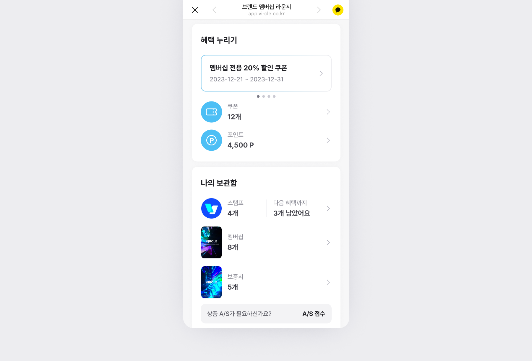 리워드 받기, A/S 접수, 쿠폰 사용 등 각 메뉴별 기능들도 한 곳에 모여있기 때문에 접근성이 좋아요.