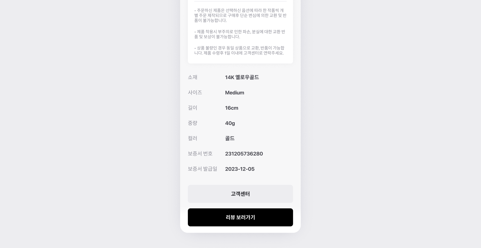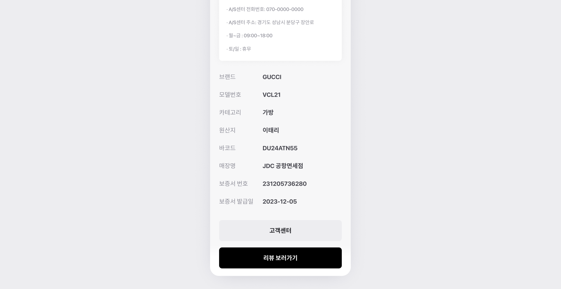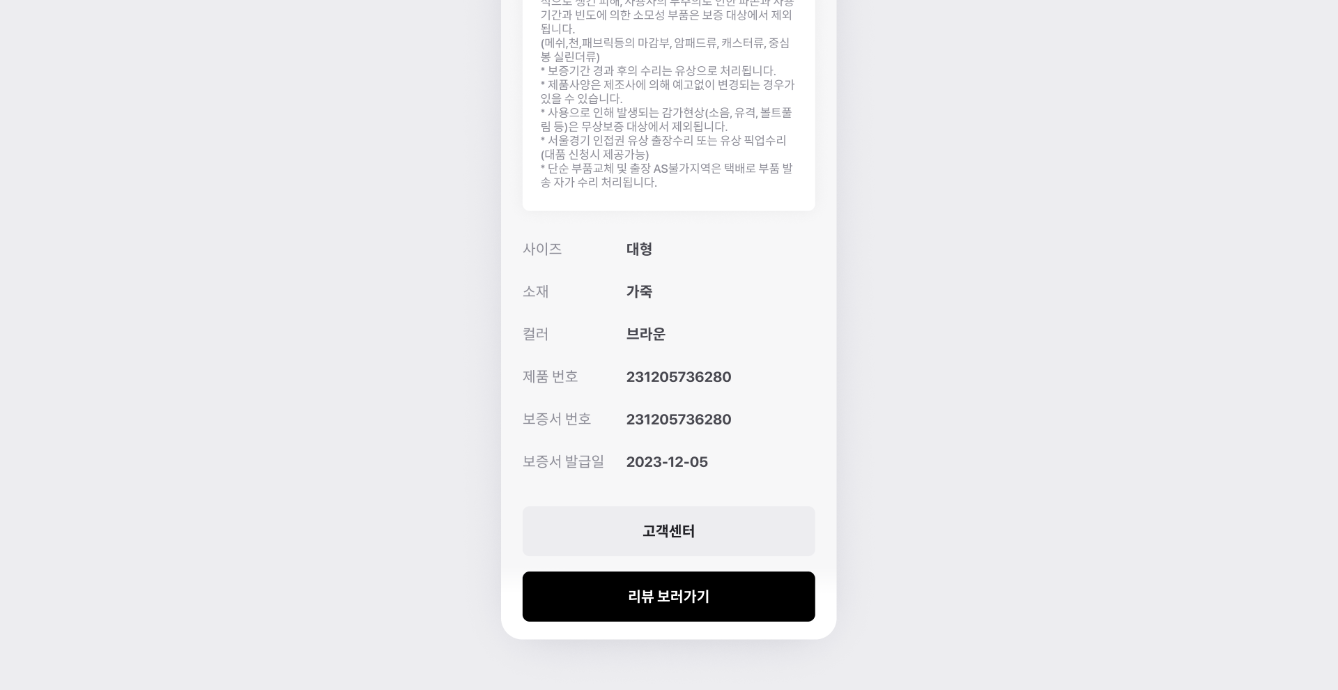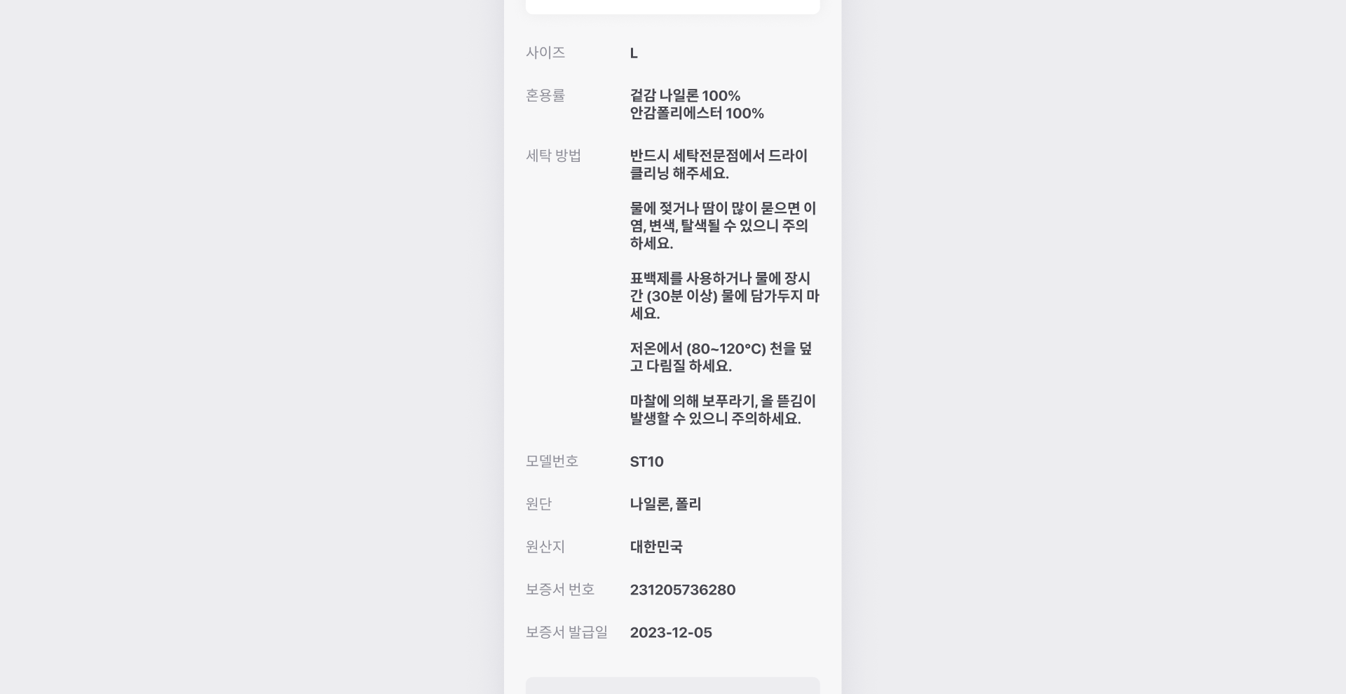 혼용률, CS 고객센터, 세탁 방법 등의 정보를 보증서에 표시할 수 있습니다.
