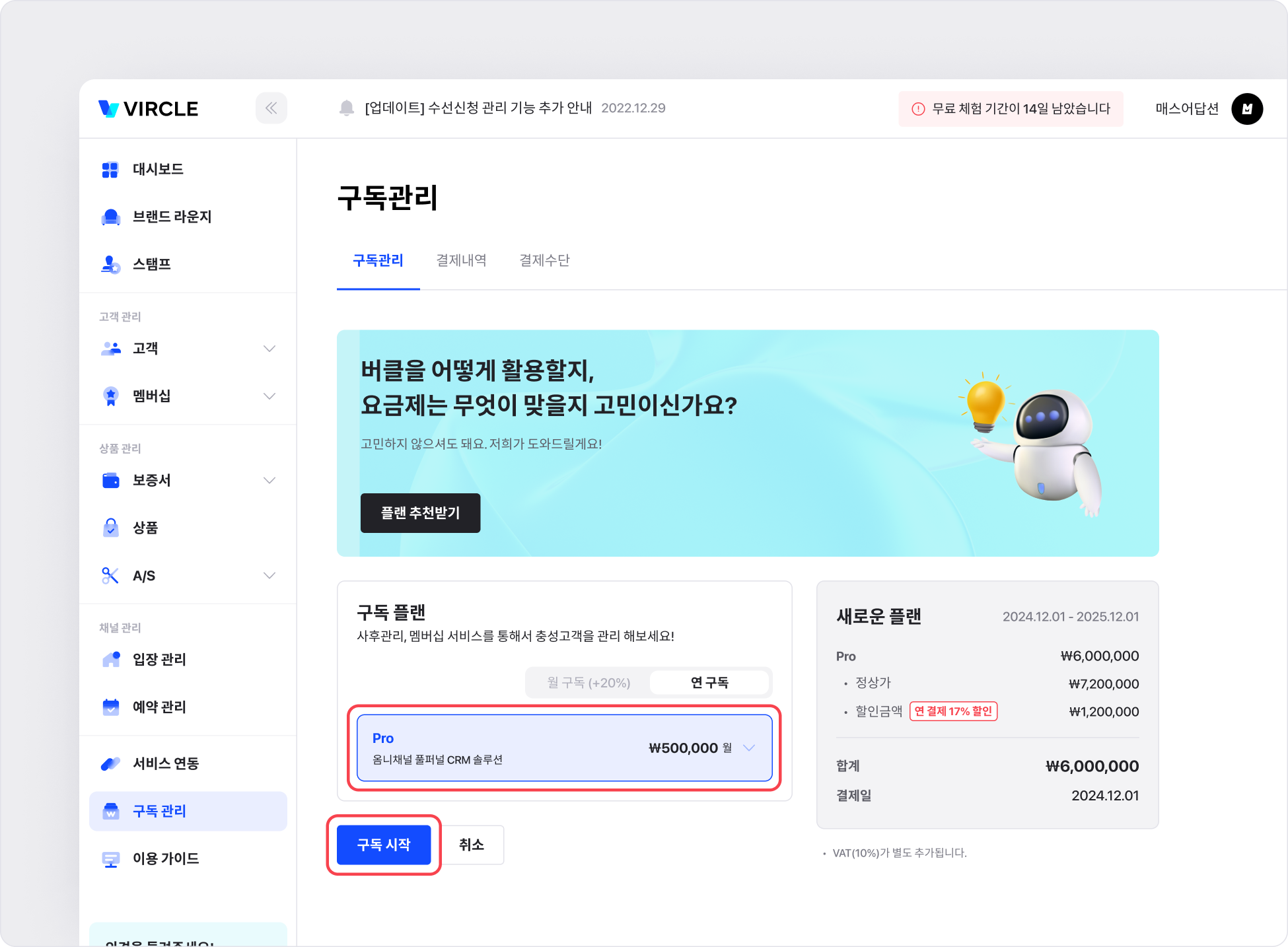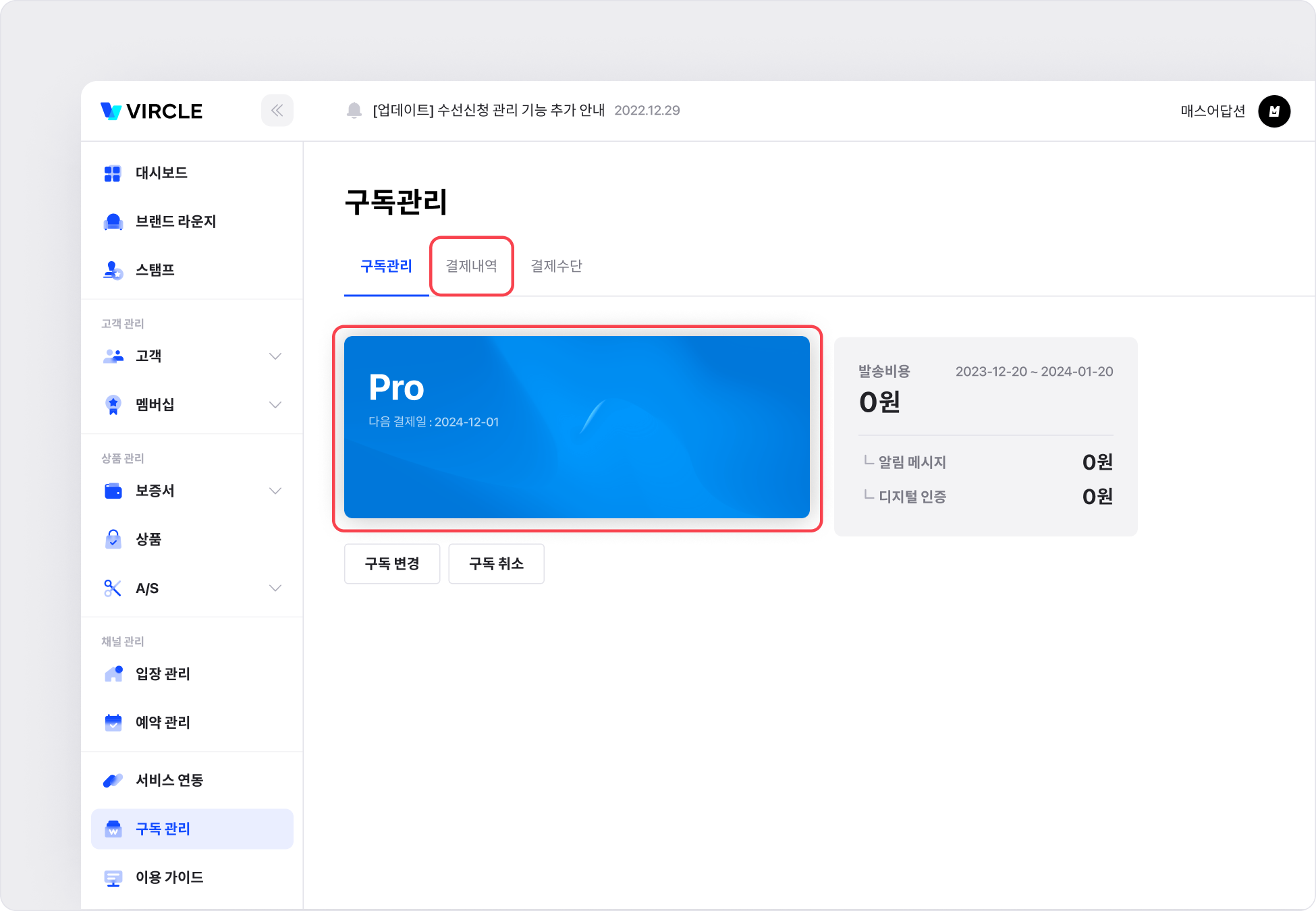 유료 플랜 구독은 [구독관리] 메뉴에서 가능합니다.