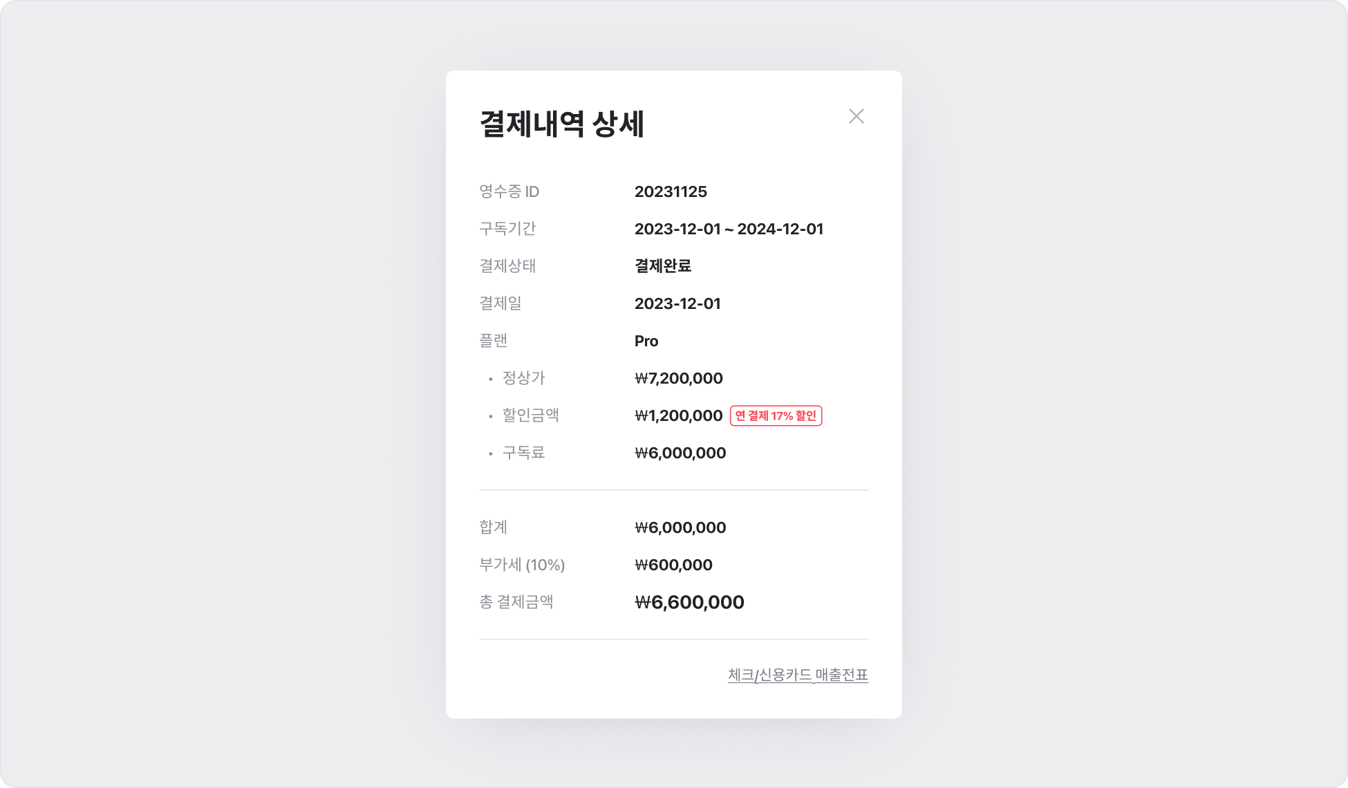 구독을 클릭하면, 결제수단을 최초 등록하는 팝업이 표시됩니다.