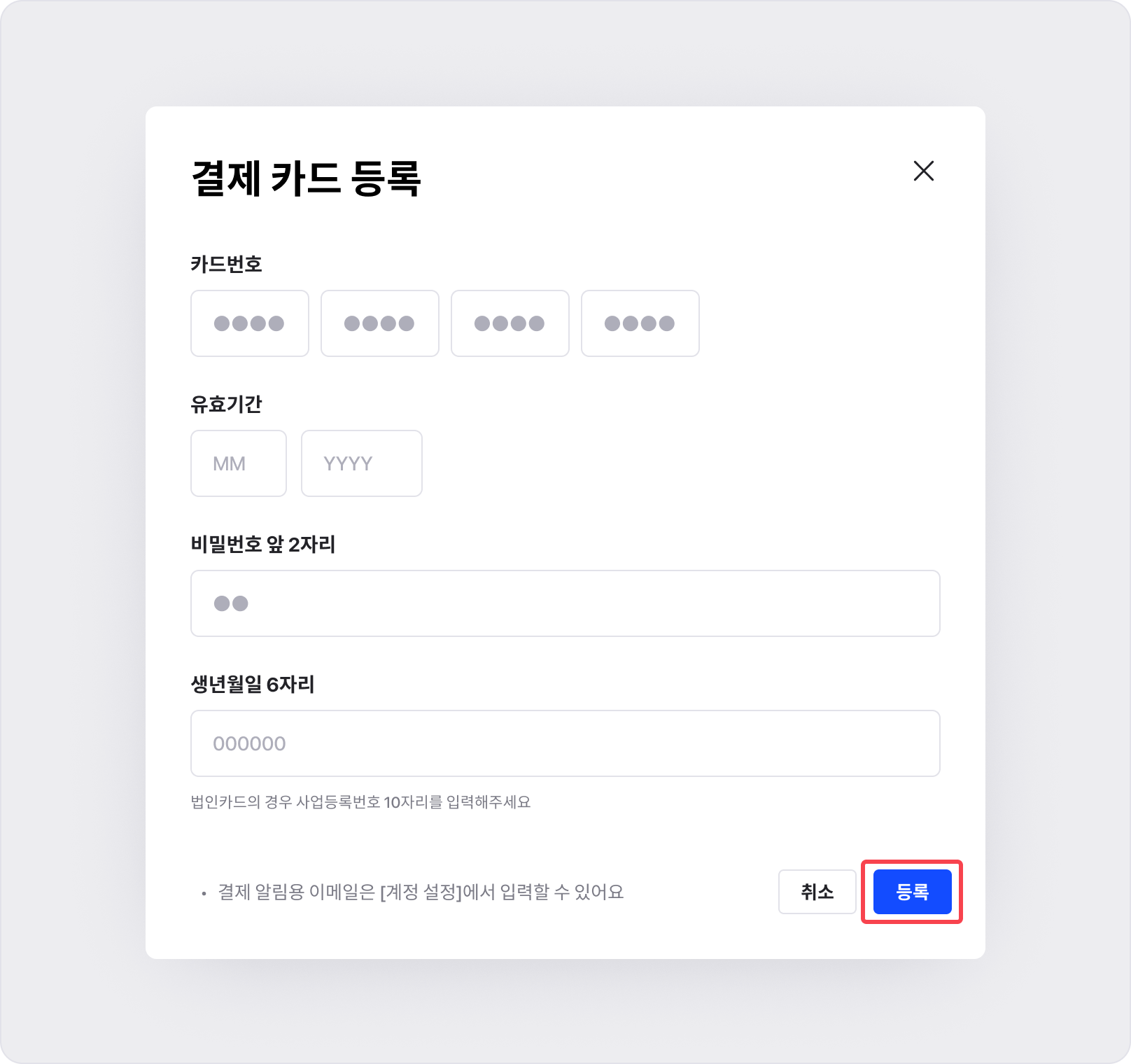등록을 클릭하면, 결제 카드가 등록됩니다.[결제완료 / 결제실패 / 플랜 취소 / 플랜 업그레이드 요청 / 환불] 안내 받을 이메일은