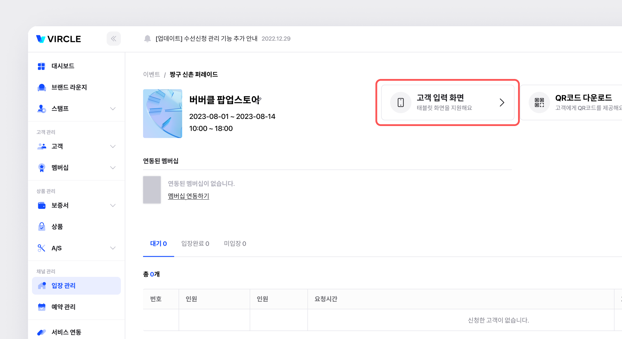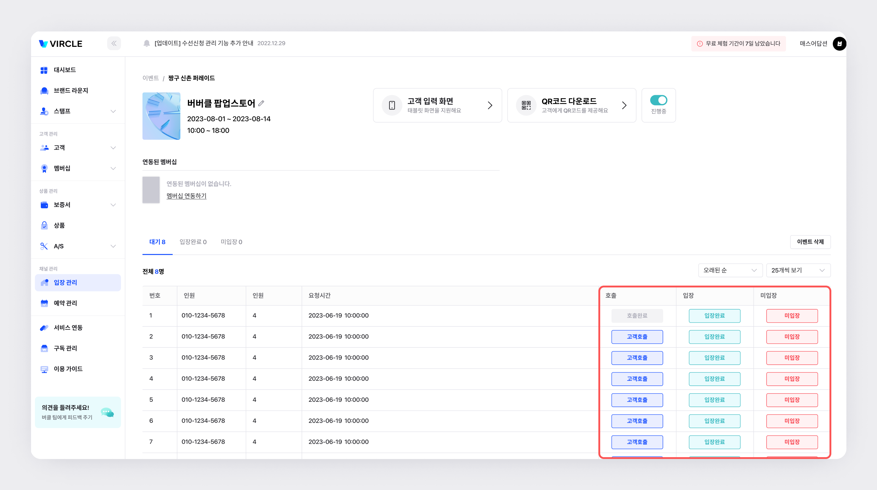 [이벤트 상세]에서 입장 대기 중인 고객 목록을 볼 수 있습니다.
