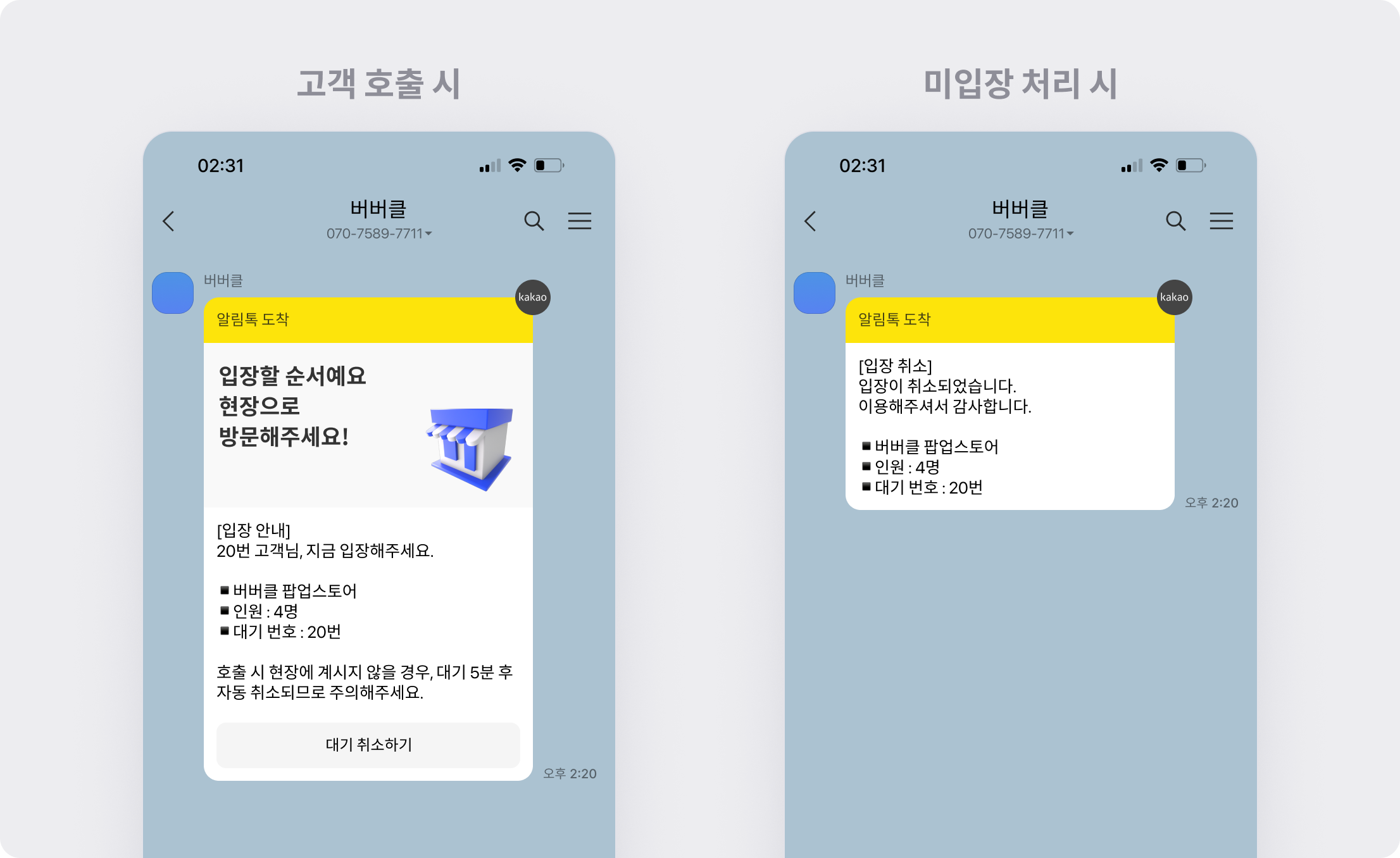 고객 호출 시 / 미입장 처리 시 발송되는 알림톡입니다.