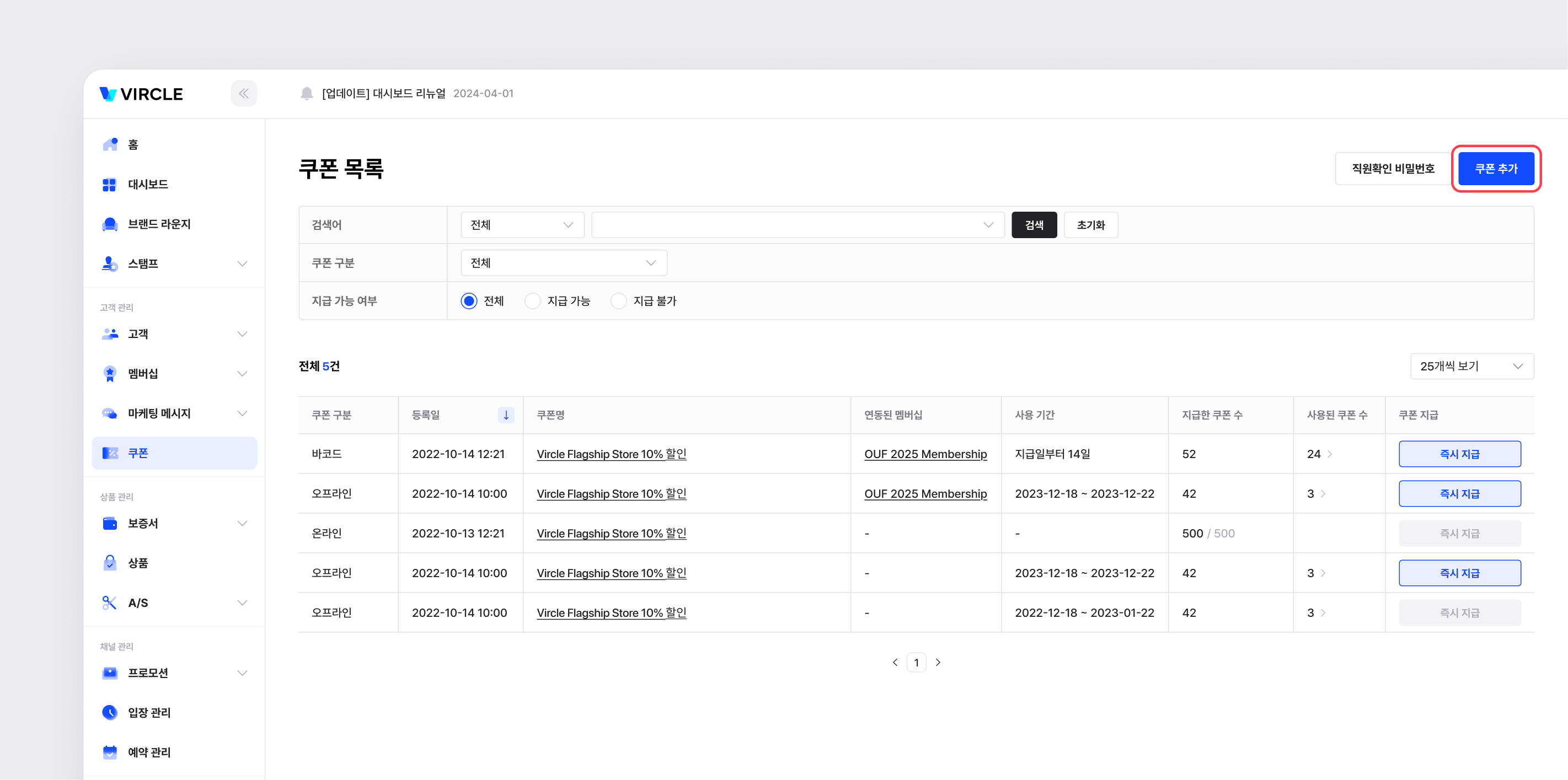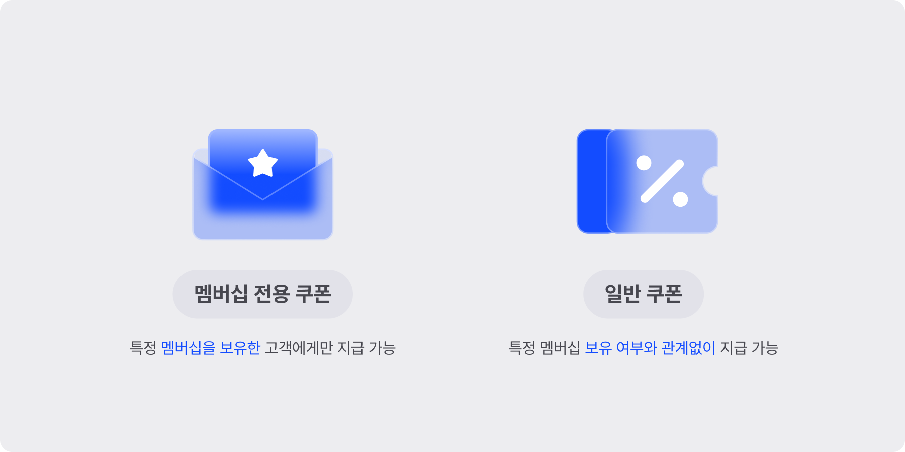쿠폰은 특정 고객에게 즉시 지급(수동 지급) 또는 자동 지급(멤버십 연동)할 수 있습니다.