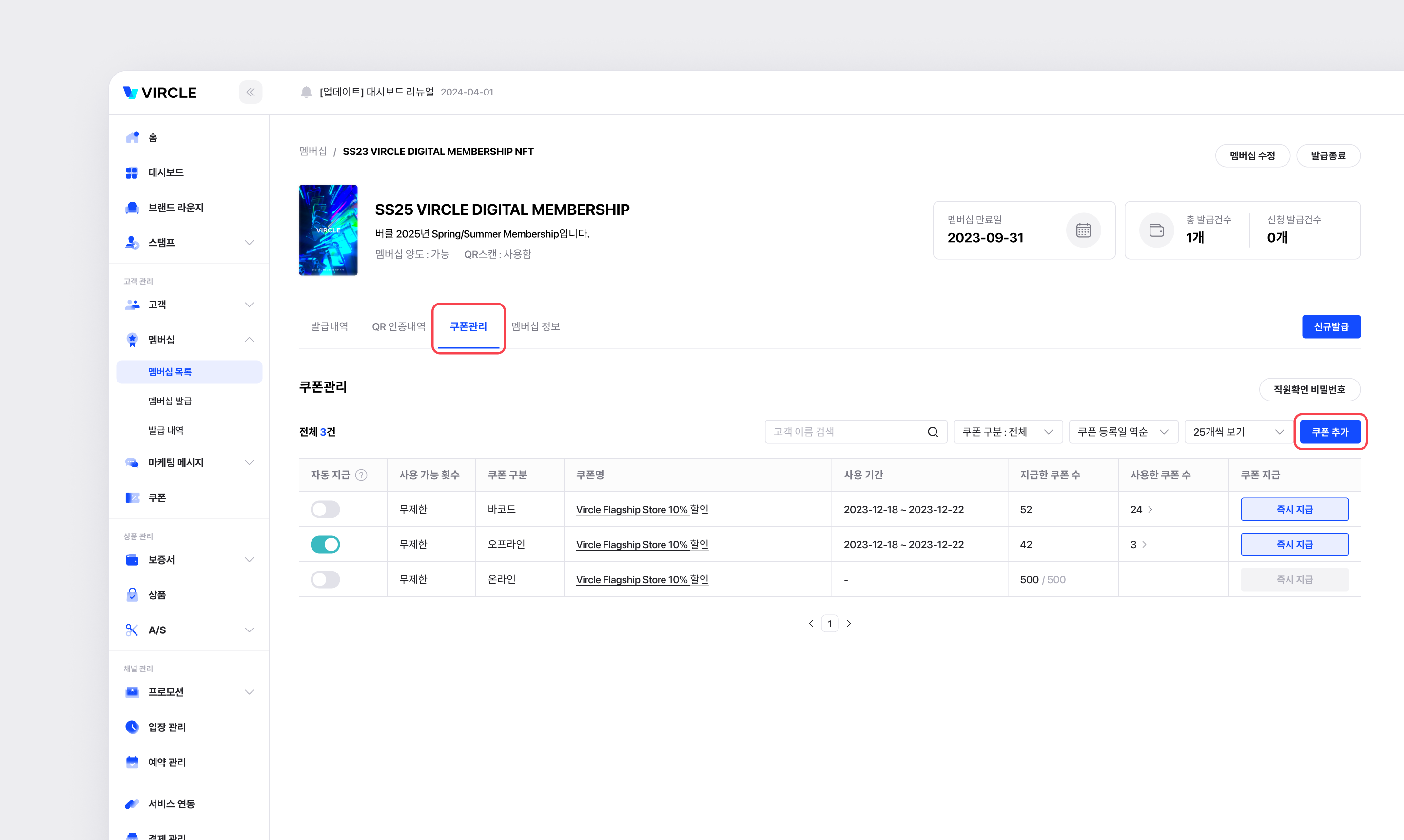 쿠폰을 넣고 싶은 멤버십의 [멤버십 상세] 페이지 - [쿠폰관리] 탭 -