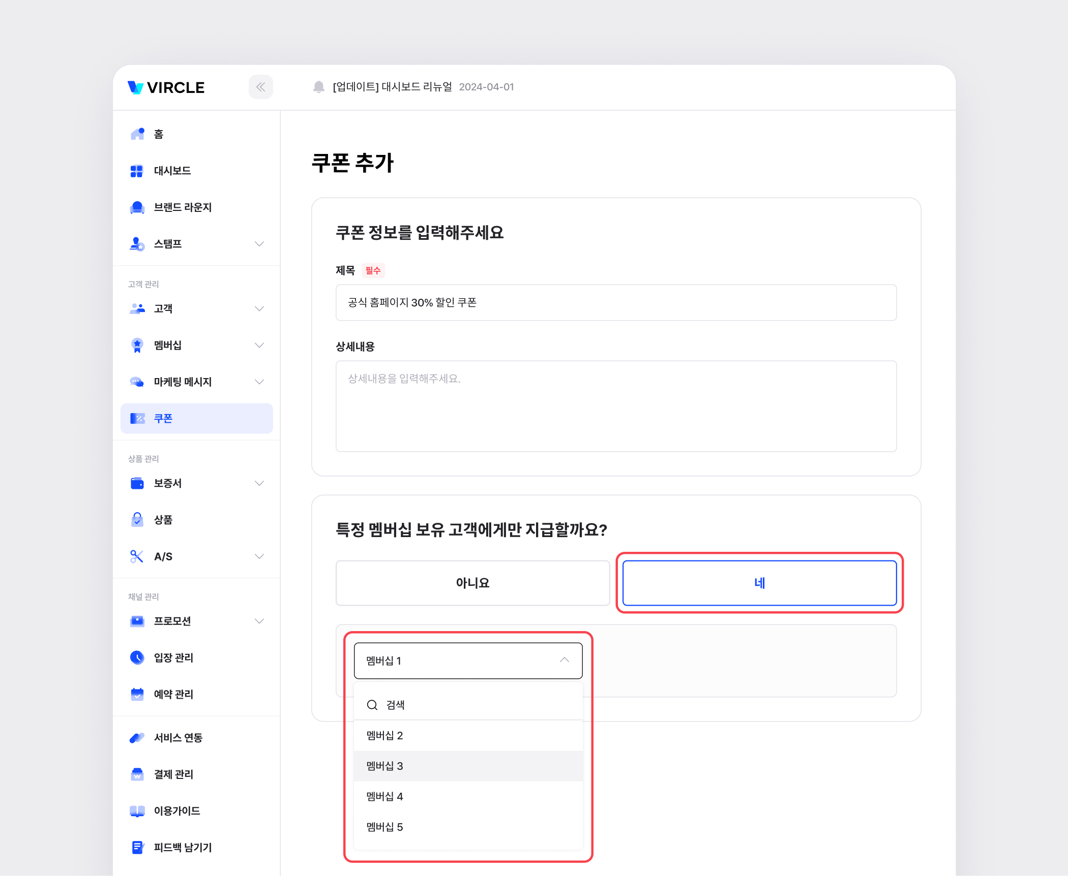 [쿠폰 추가] 페이지에서 [특정 멤버십 보유 고객에게만 지급할까요?]에