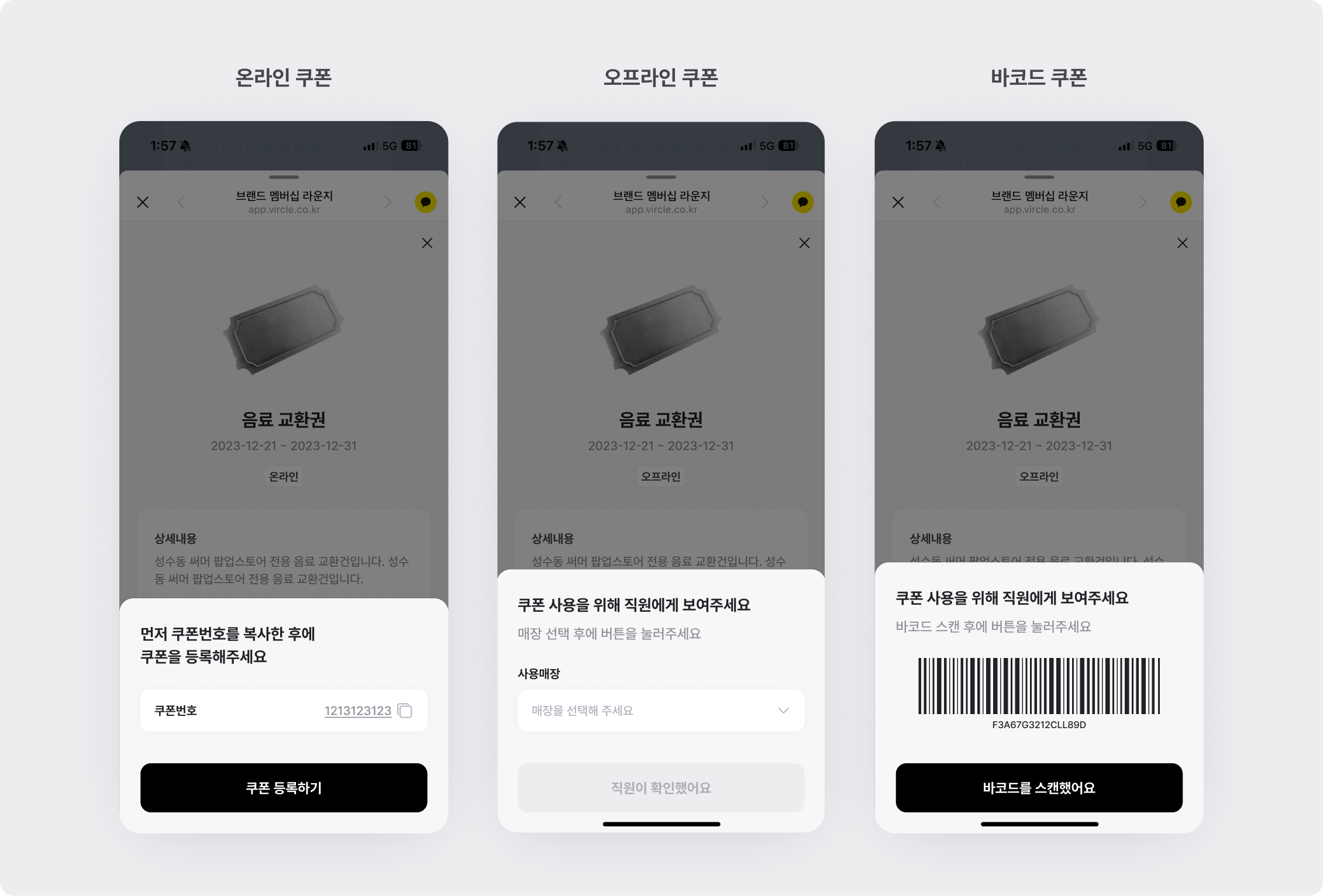 고객은 지급된 쿠폰을 브랜드 라운지 내 [쿠폰] 메뉴에서 확인 및 사용할 수 있습니다.