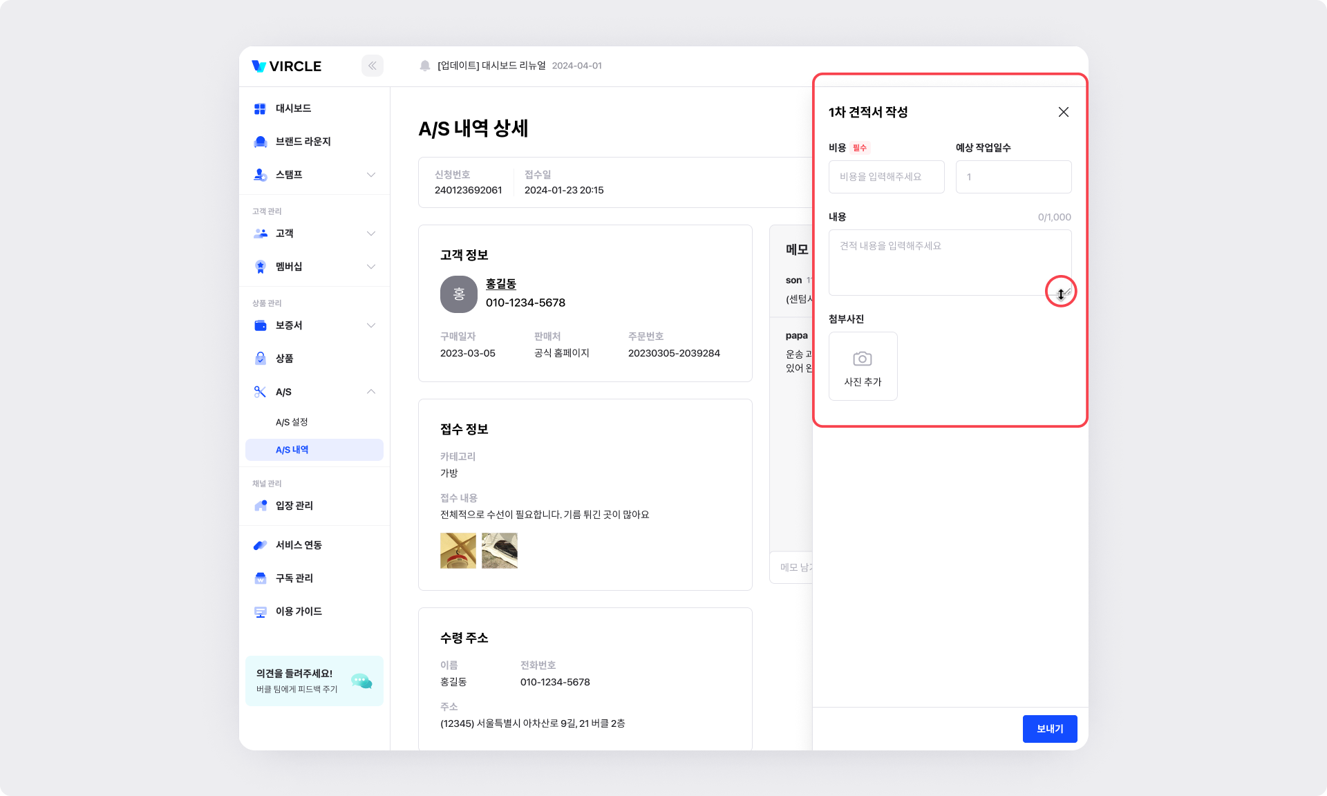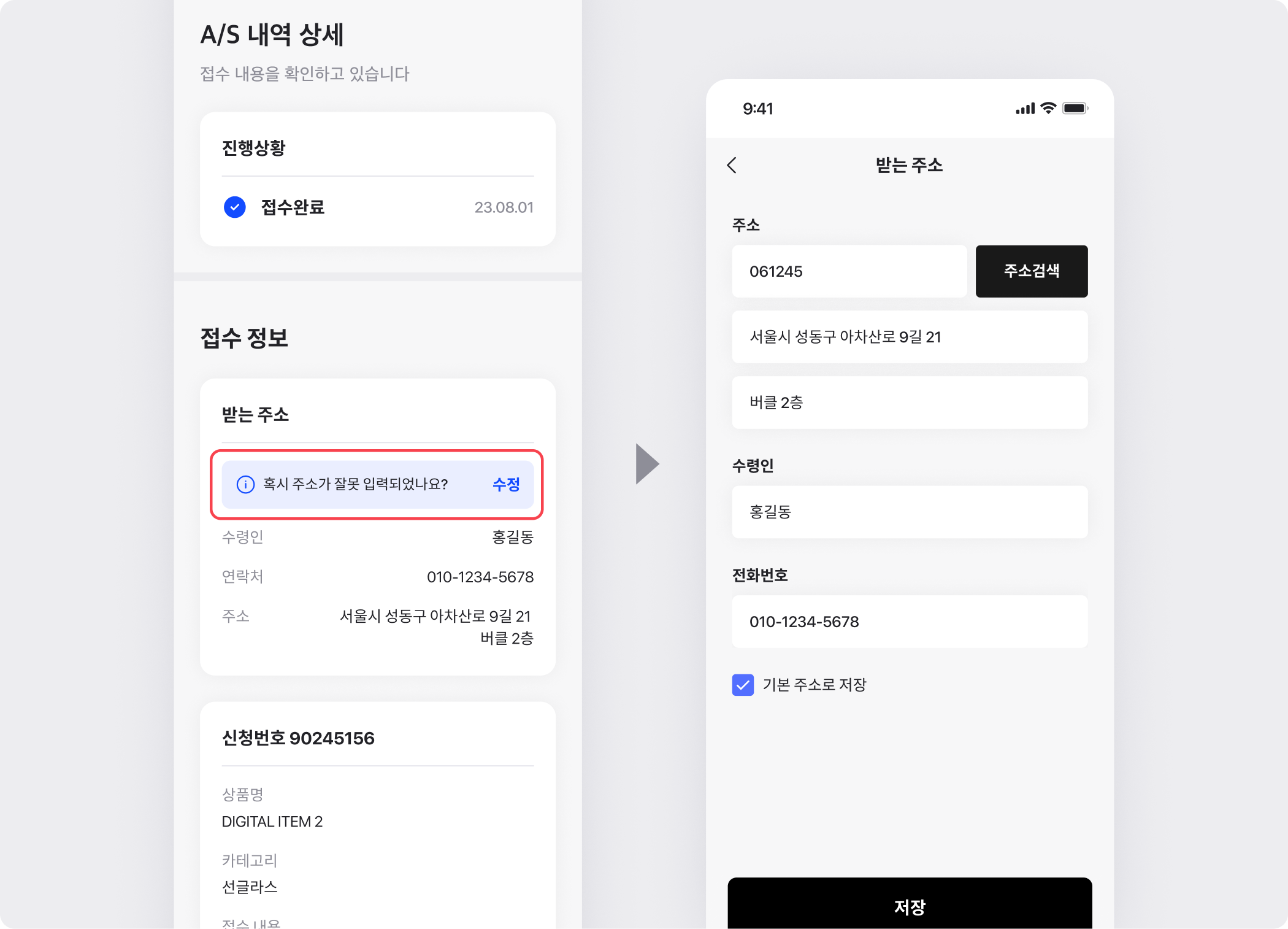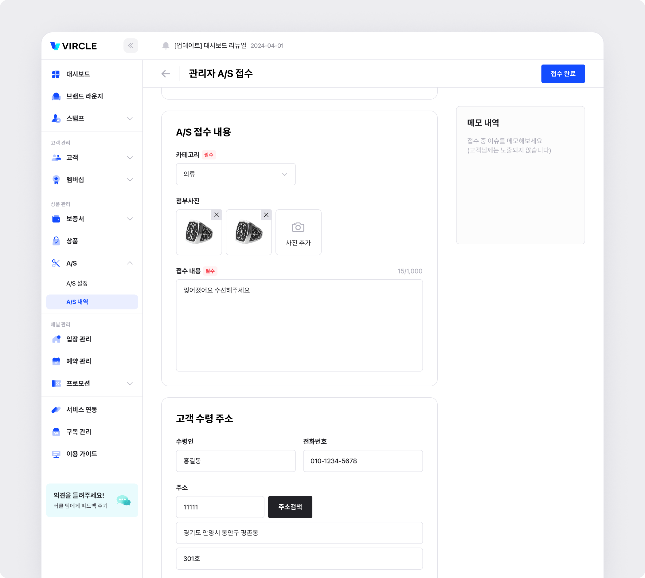 고객이 요청한 대로 A/S 접수 내용과 고객 수령 주소를 입력해주세요.