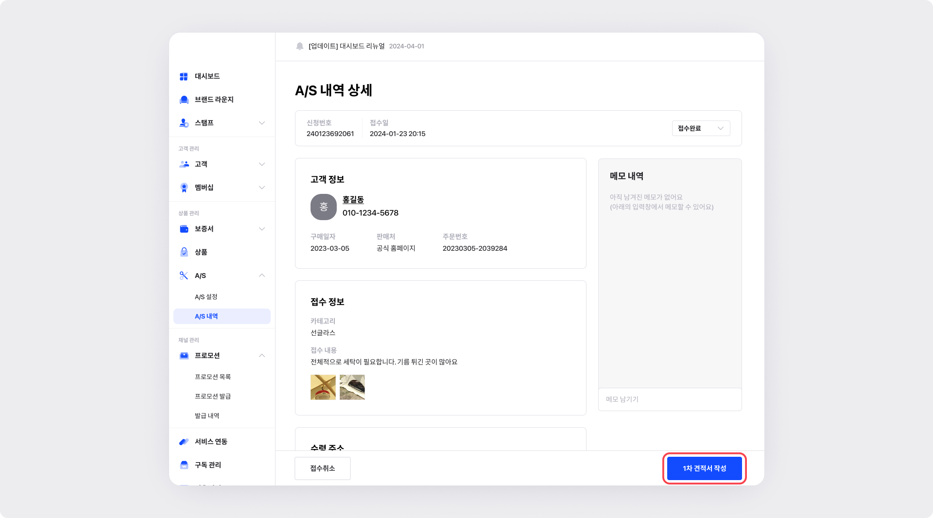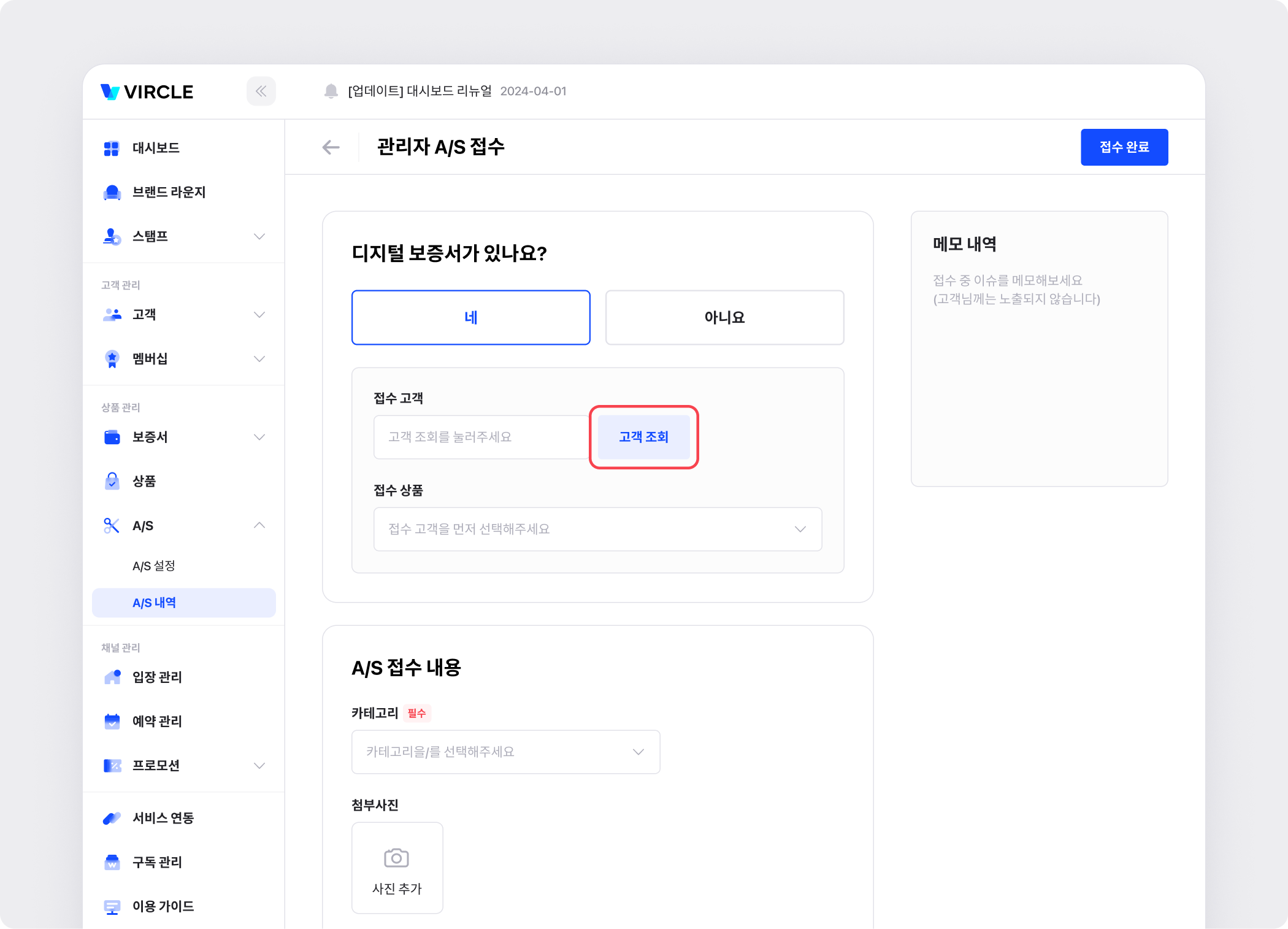 A/S 접수 중 공유할 내용은 메모 내역에 남겨주세요!