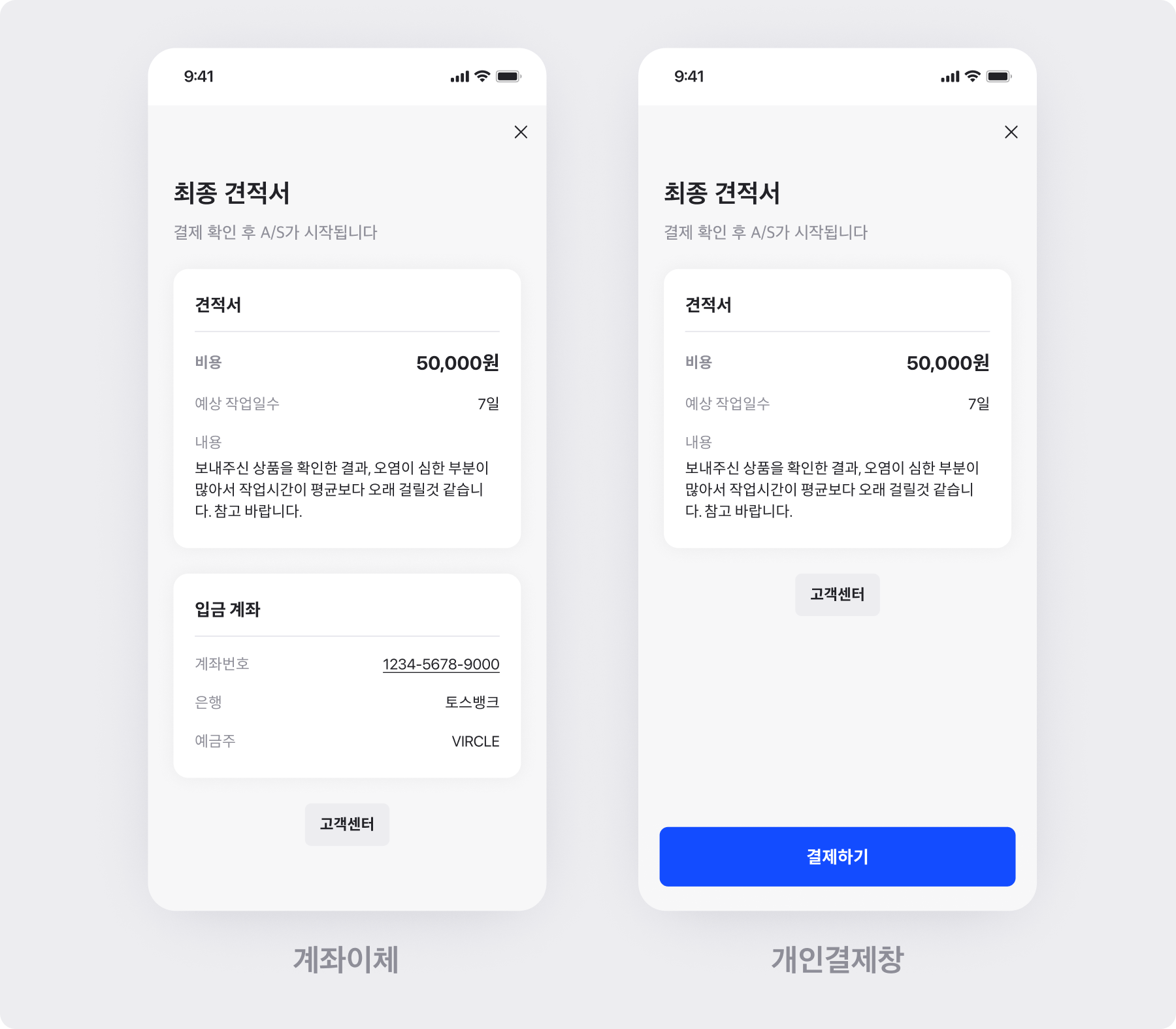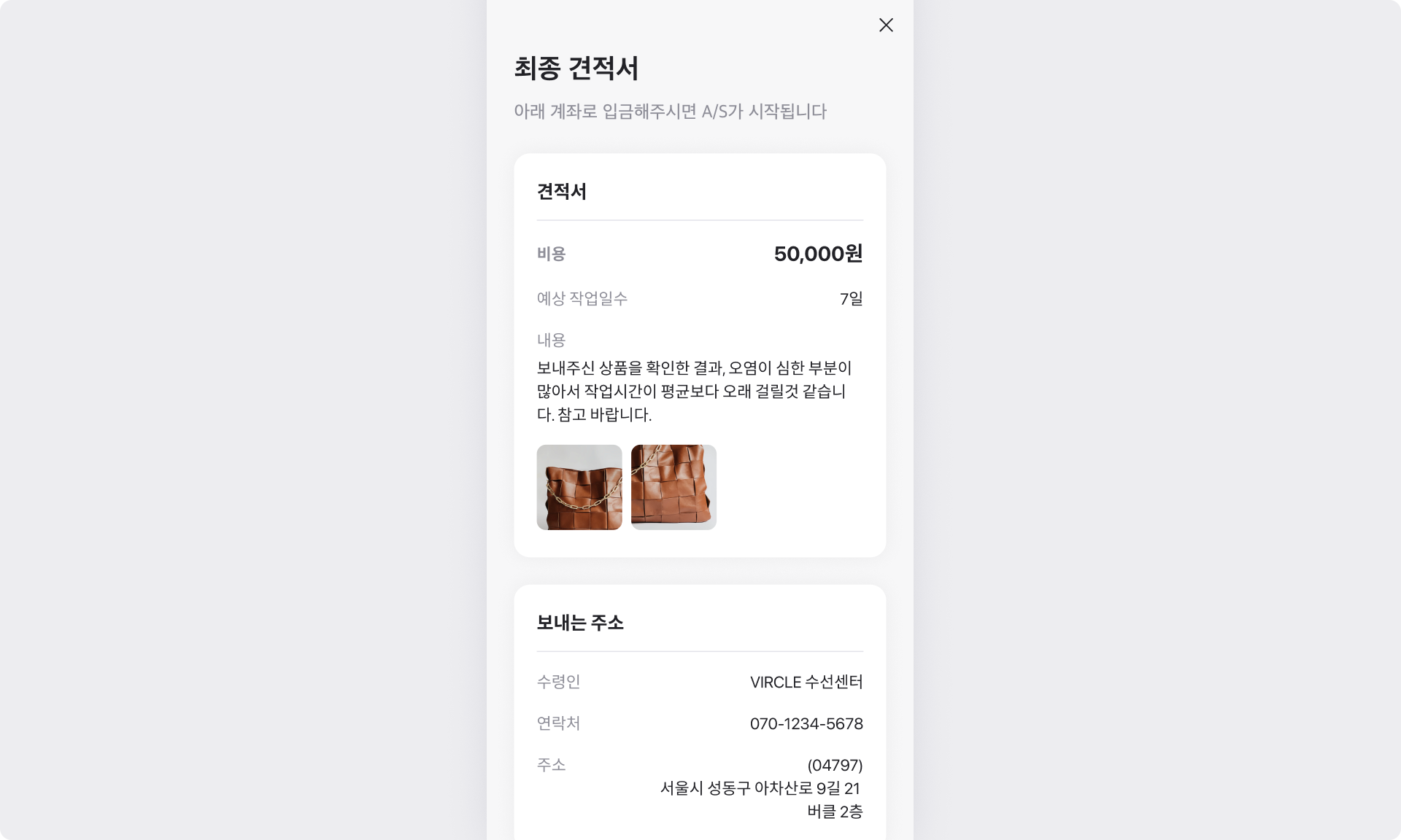 최종 견적서에 계좌 정보가 보여져요. 고객은 이 계좌 정보를 보고 송금을 하게 돼요.