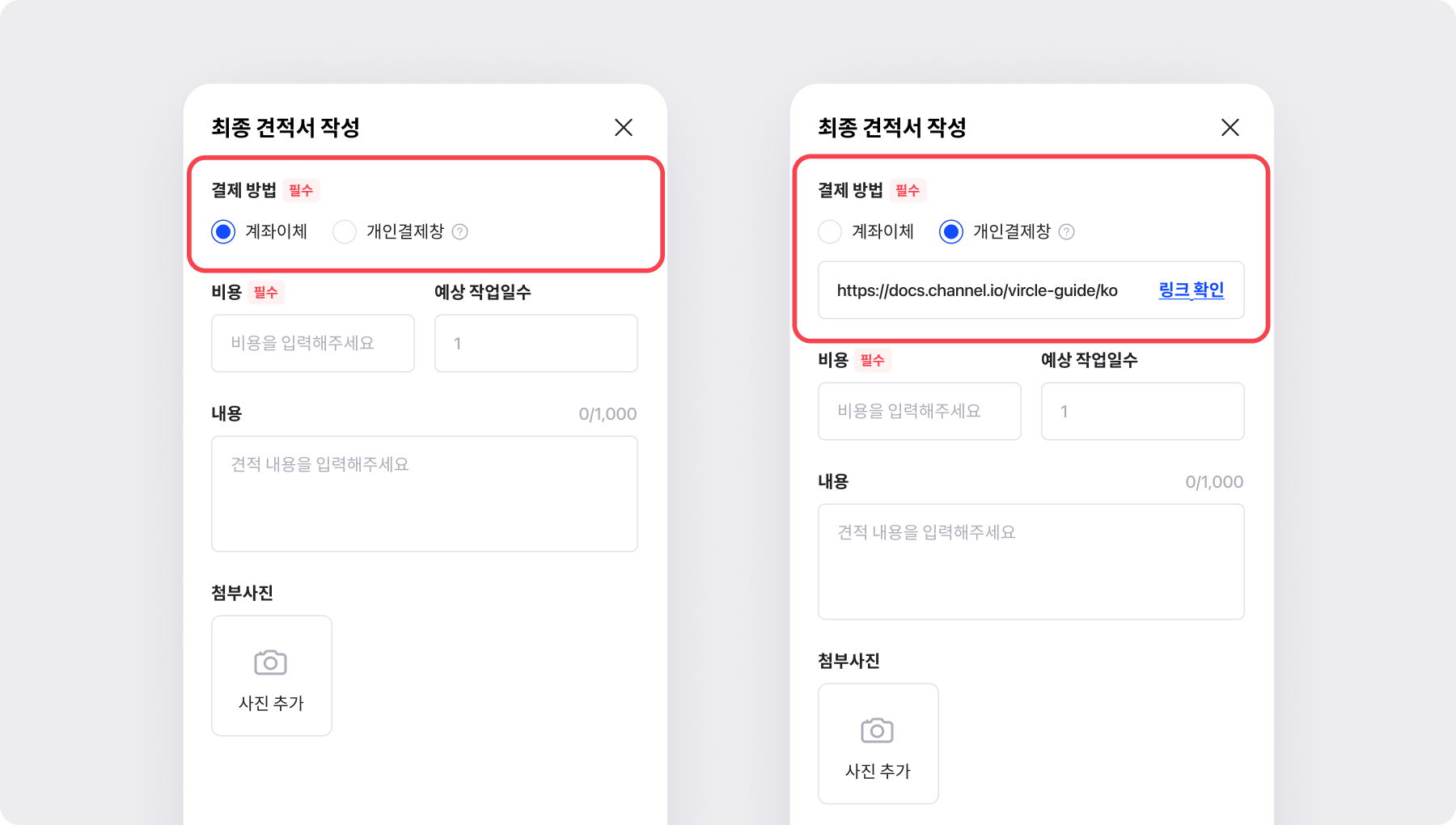 개인결제창 링크를 첨부할 수 있어요. 계좌 정보 대신