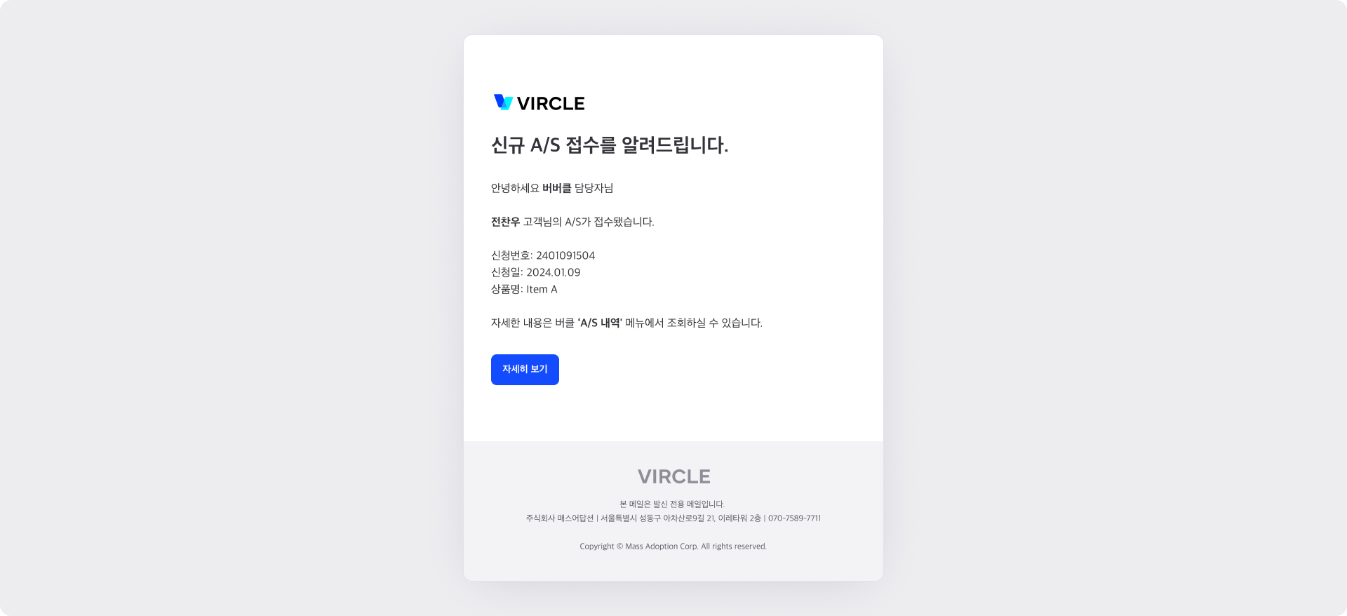 신규 접수가 생기면 담당자 이메일로 [신규 A/S 접수 이메일]이 발송됩니다.