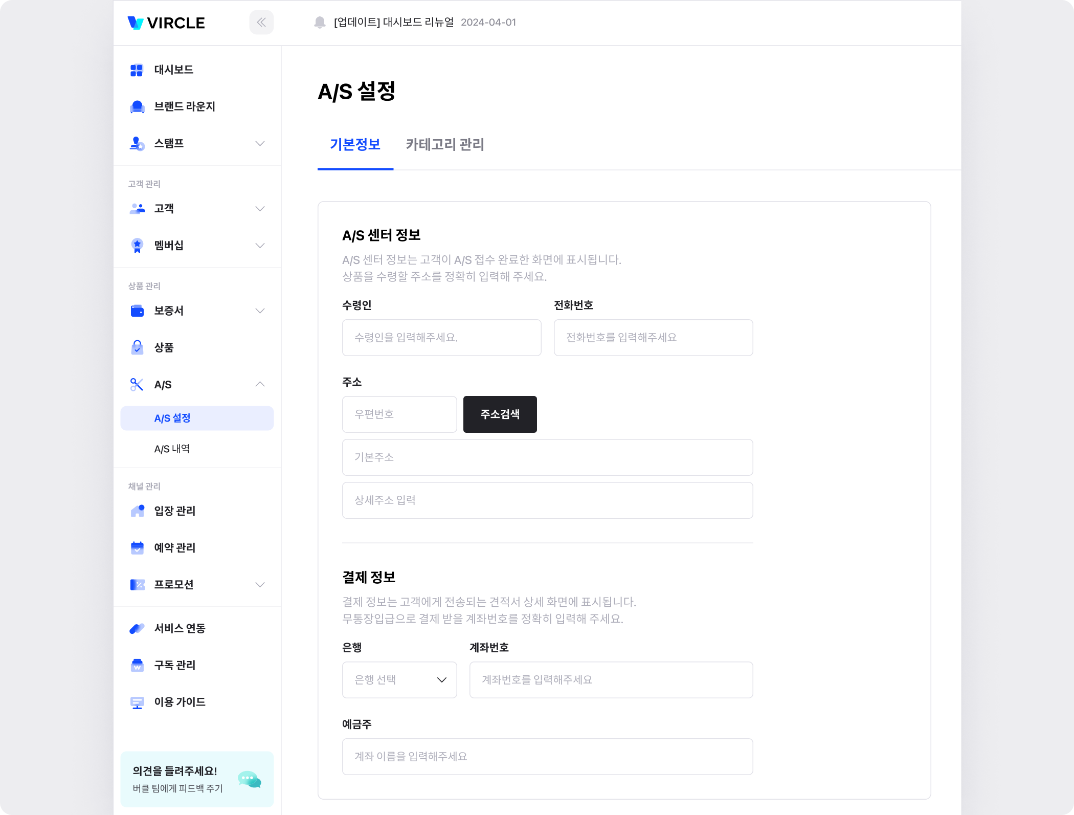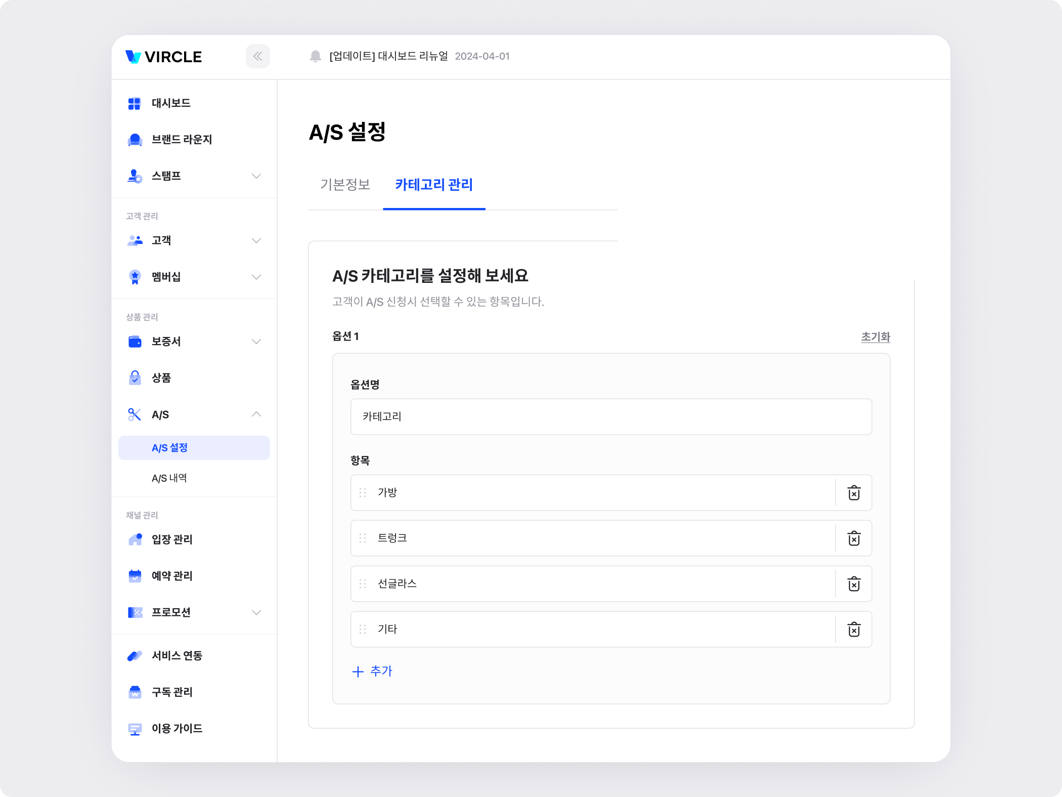 설정한 카테고리는 고객이 A/S 접수 시, 선택하는 메뉴로 노출됩니다.
