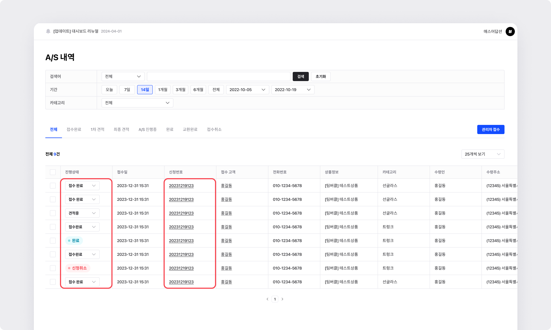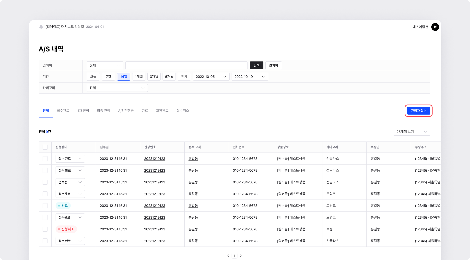 다양한 A/S 유형을 카테고리로 분류해서 간편하게 A/S를 관리해 보세요.