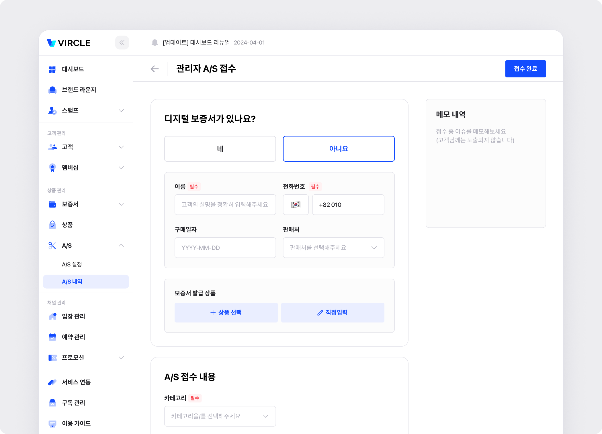 A/S 과정에서 내부에 공유할 내용을 메모할 수 있어요!