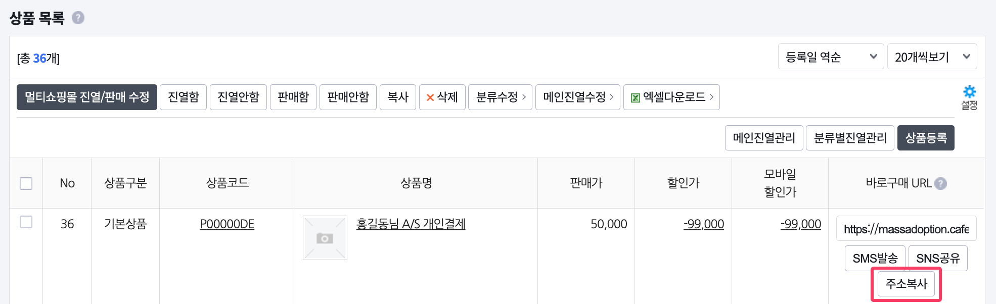 '상품' → '상품 등록'에서 A/S 비용을 판매가로 입력하고, 상품분류를 '개인결제'로 선택해서 상품을 등록해주세요.
