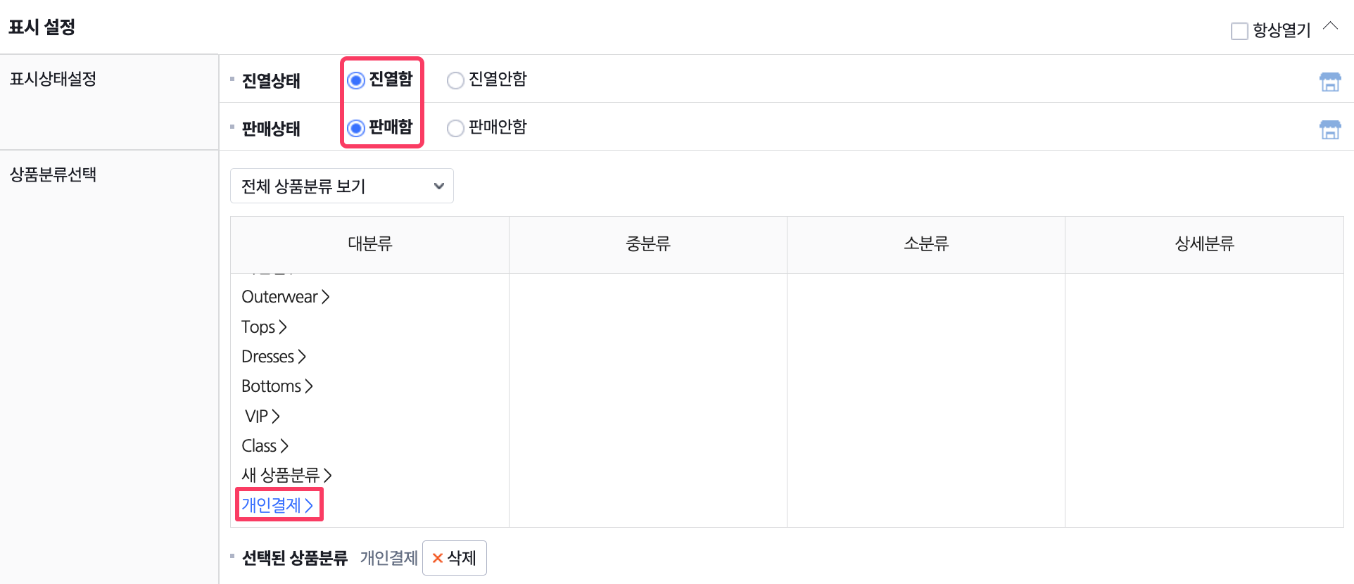 [대분류 추가]를 클릭하고 '개인결제' 대분류를 만들어주세요.