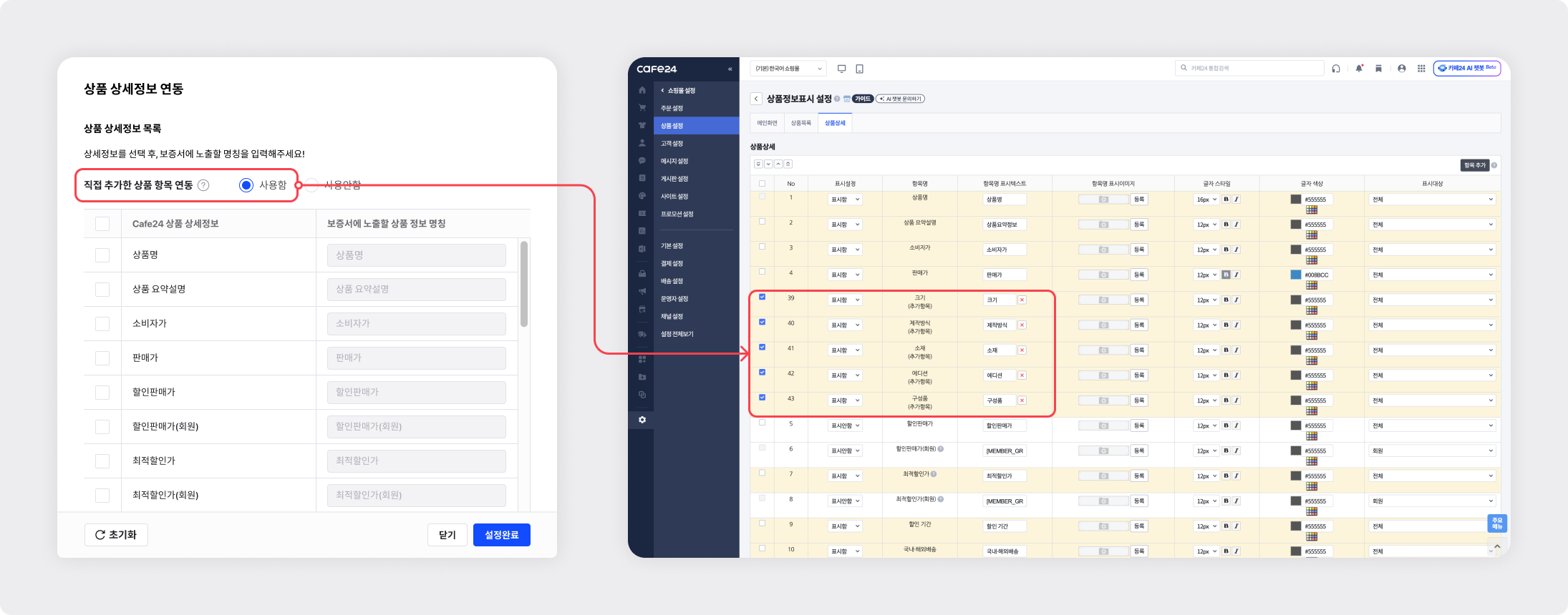 • [직접 추가한 상품 항목 연동]을 사용함으로 선택할 경우,