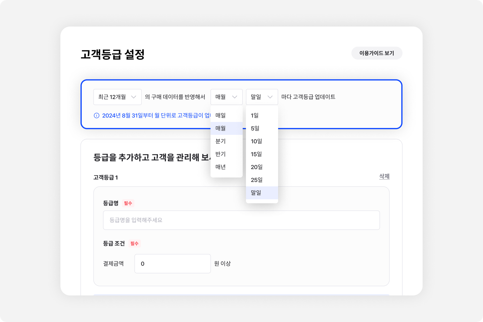 고객 등급 업데이트 주기를 상세하게 설정이 가능해졌어요.