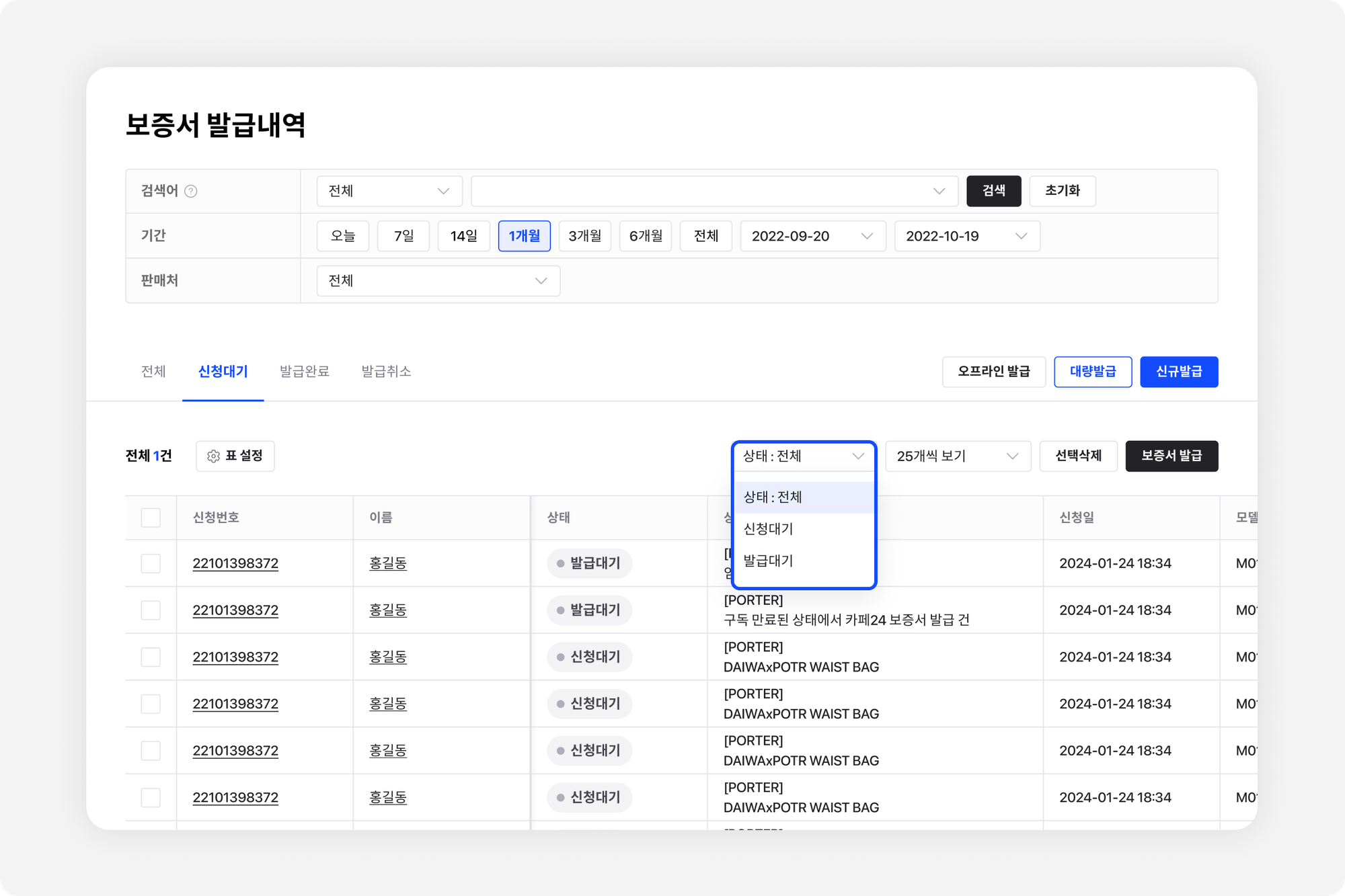 새롭게 추가된 필터로 ‘신청대기와 발급대기’를 선택해서 확인할 수 있어요.