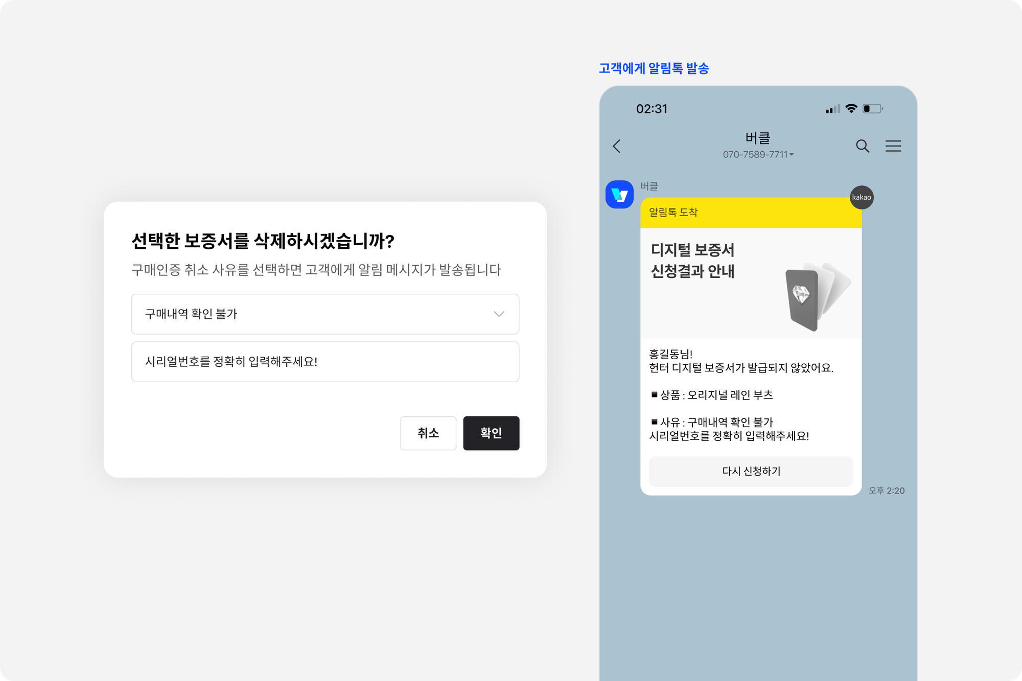 추가 정보 입력이 필요하거나, 시리얼코드 번호가 틀렸을 경우에, 구매인증 취소 사유와 설명을 입력하고 고객에게 자세한 안내 내용을 전달해 보세요.