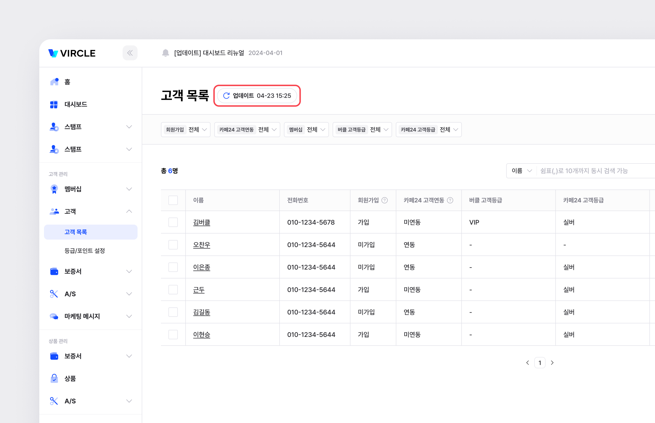 업데이트버튼을 눌러 원하는 때에 고객을 불러올 수 있도록 수정되었어요!*수동으로 업데이트하지 않아도, 새벽마다 자동으로 업데이트돼요.