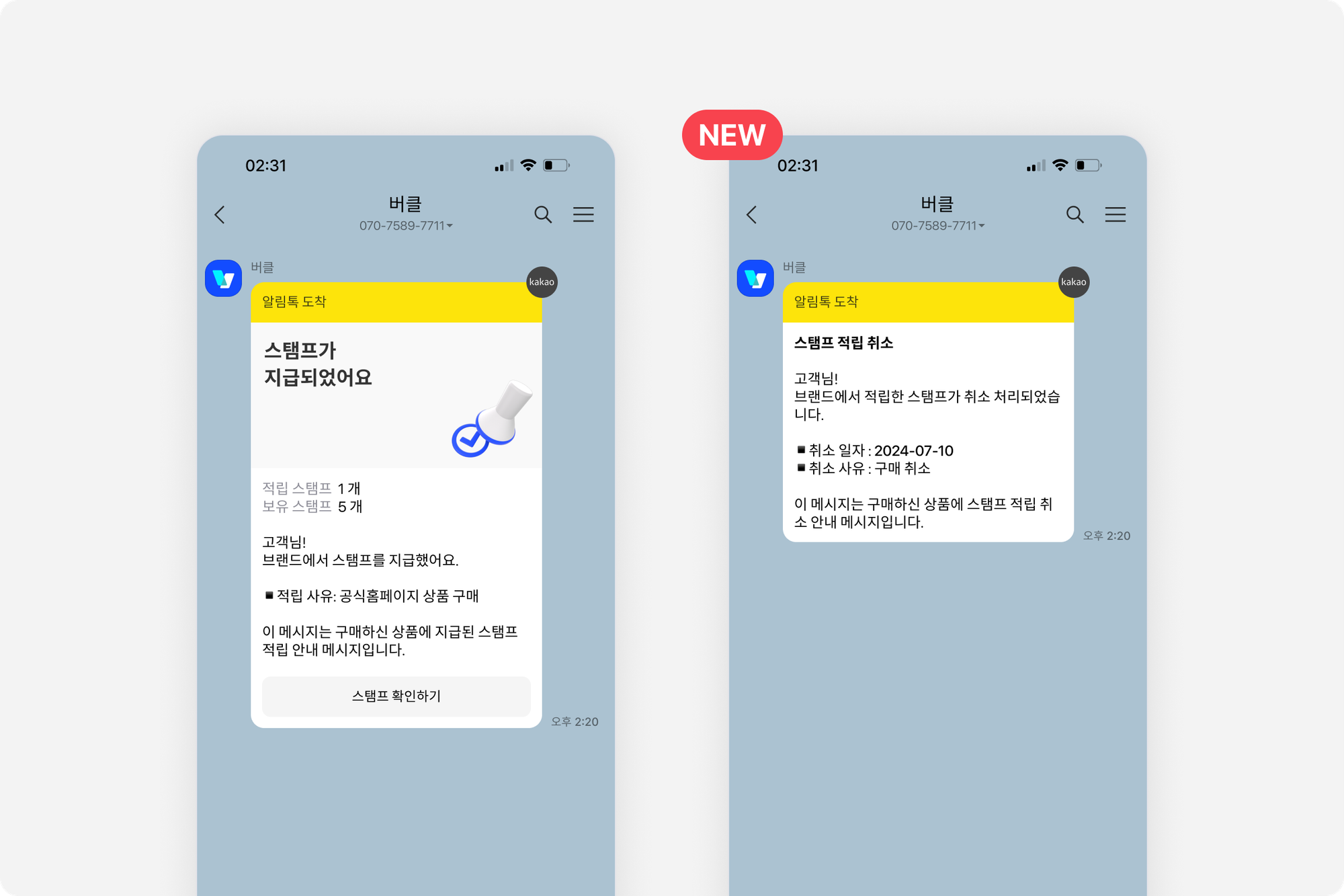 스탬프에 연결된 주문 건이 ’주문취소’가 되었을 경우, 고객에게 ‘스탬프 적립 취소’ 알림톡이 자동 발송되도록 추가됐어요.