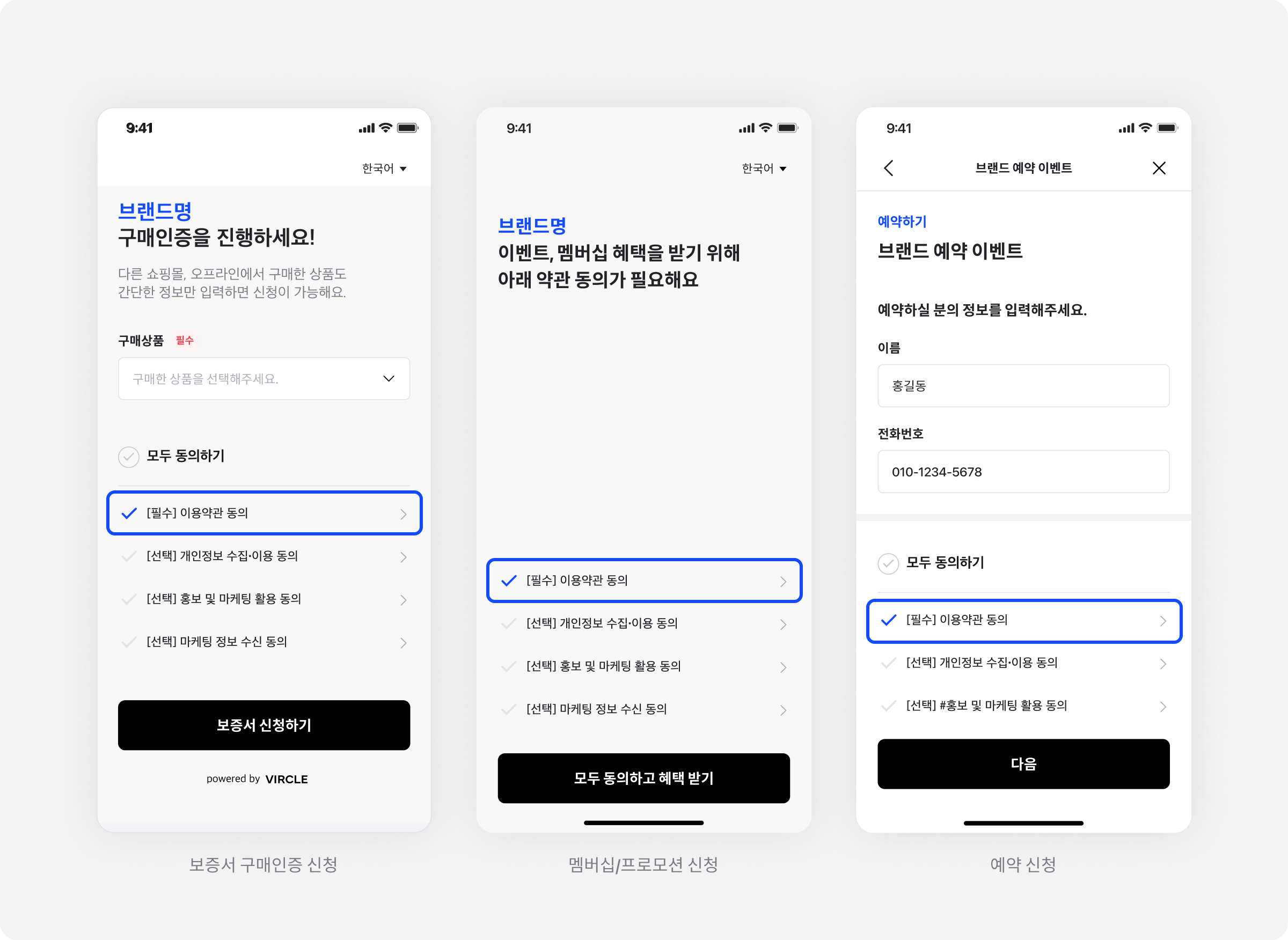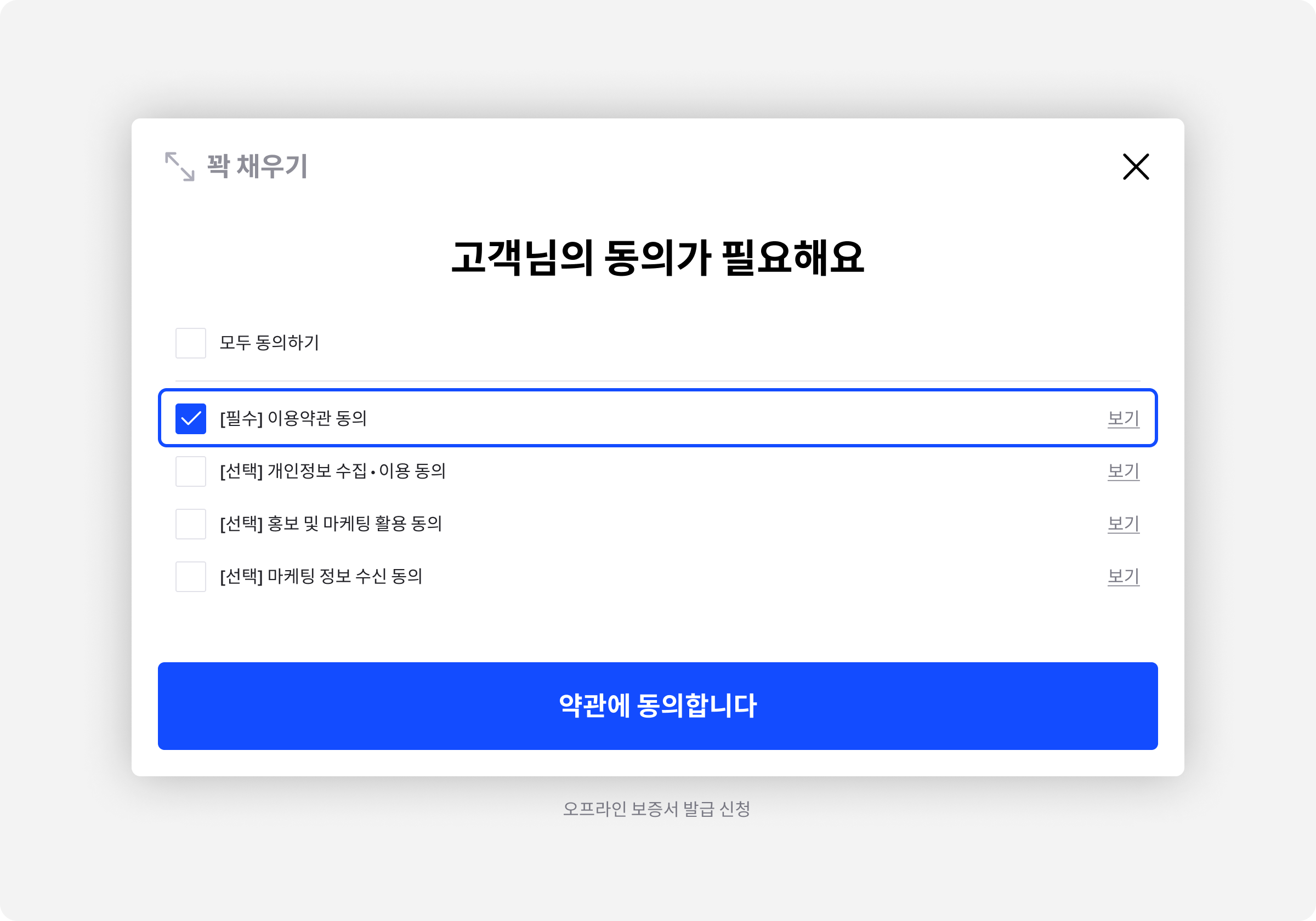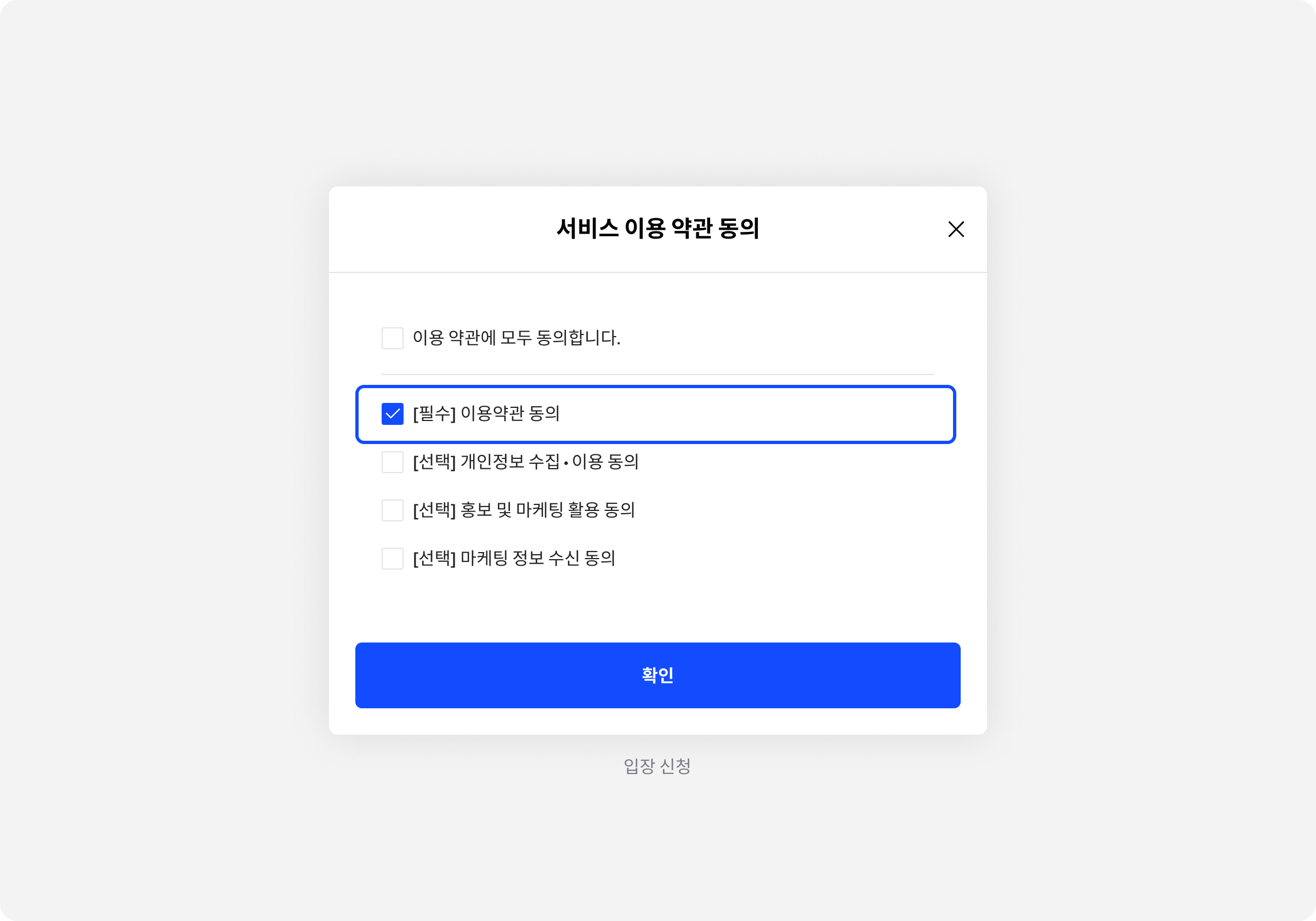 [계정 설정]에 등록한 '브랜드 서비스 이용약관'은 고객이 직접 서비스를 신청하는 모든 화면에 자동으로 표시됩니다.