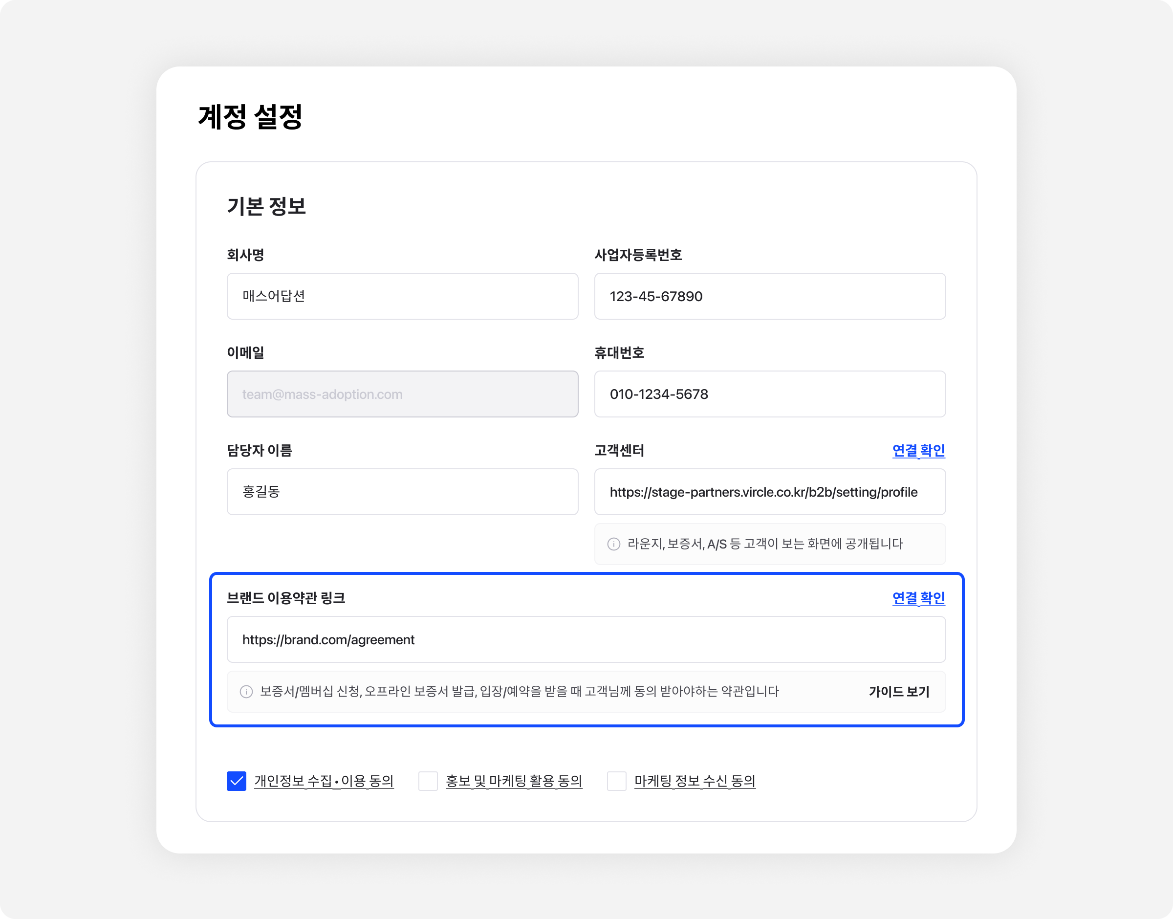 계정 설정에 [브랜드 이용약관 링크]를 등록하는 메뉴가 새롭게 추가됐어요.
