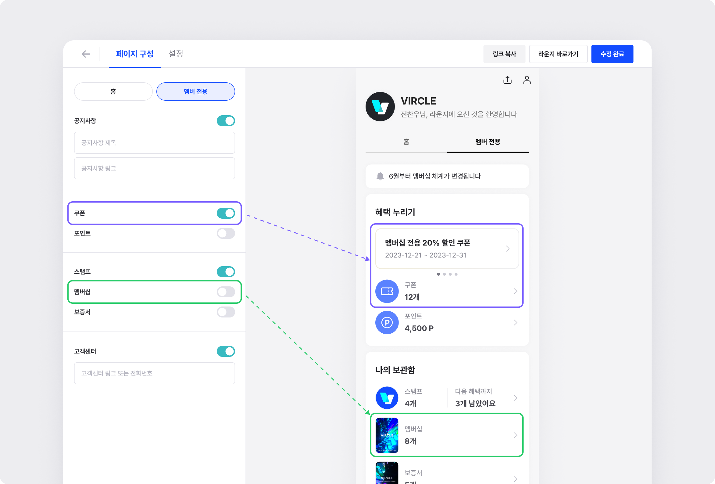 이제 [라운지 설정 > 페이지 구성]에서 멤버십과 쿠폰의 노출 여부를 각각 설정할 수 있어요.