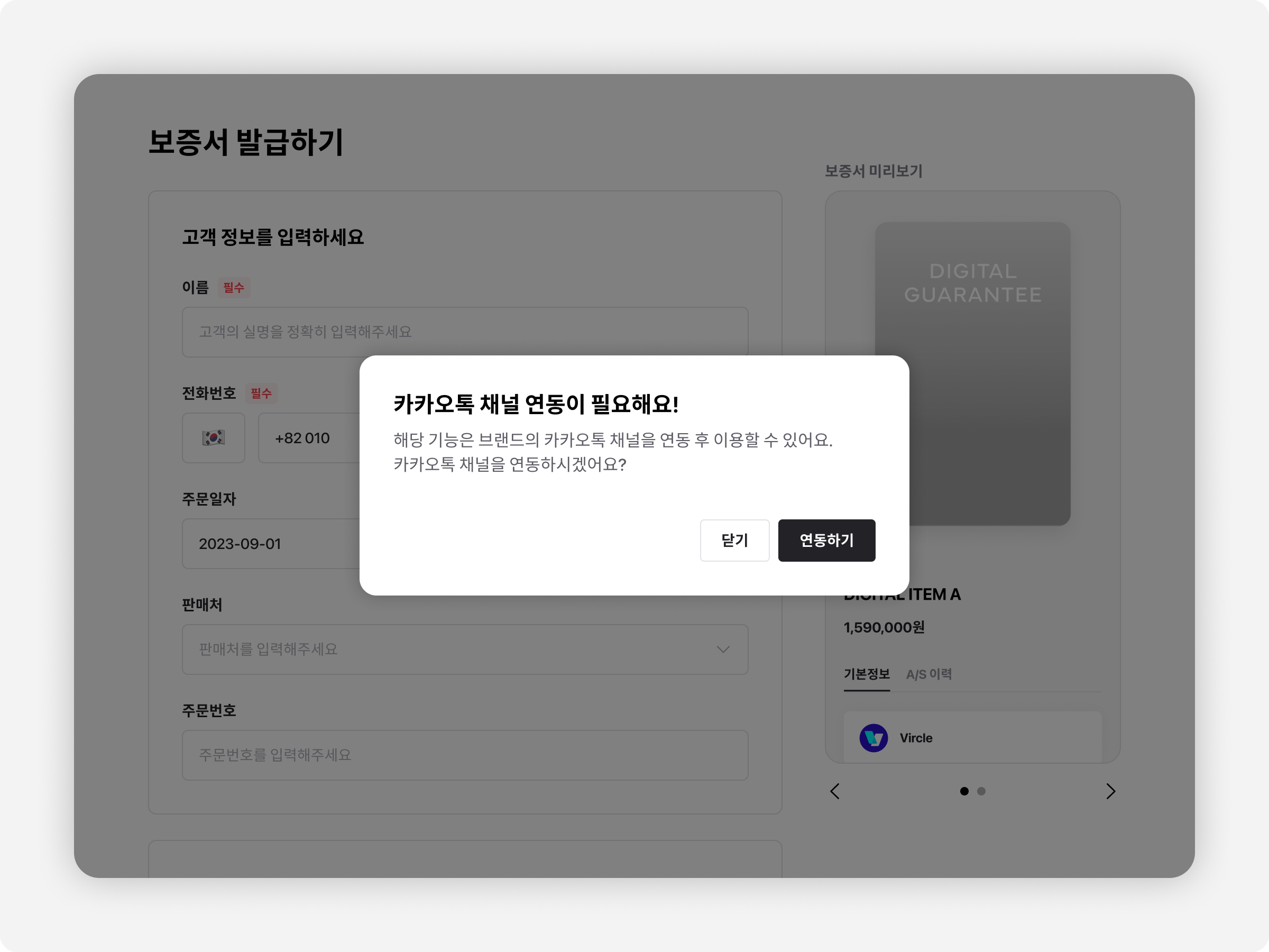 고객에게 개별 발급하는 보증서와 멤버십은 모두 카카오톡 채널 연동 후 사용이 가능하도록 변경됐어요.