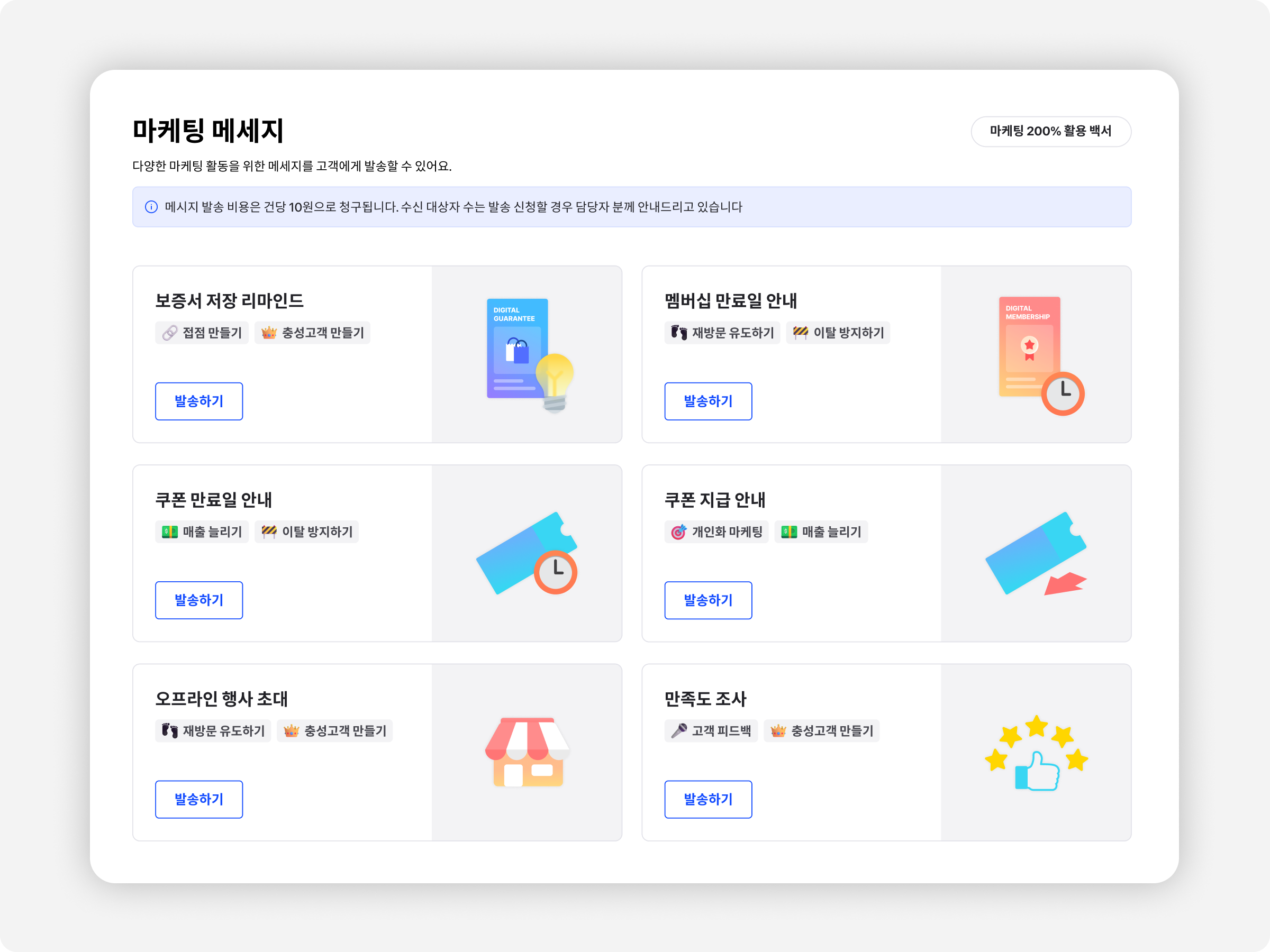 마케팅 메시지 발송 비용은 건당 10원으로 청구됩니다.