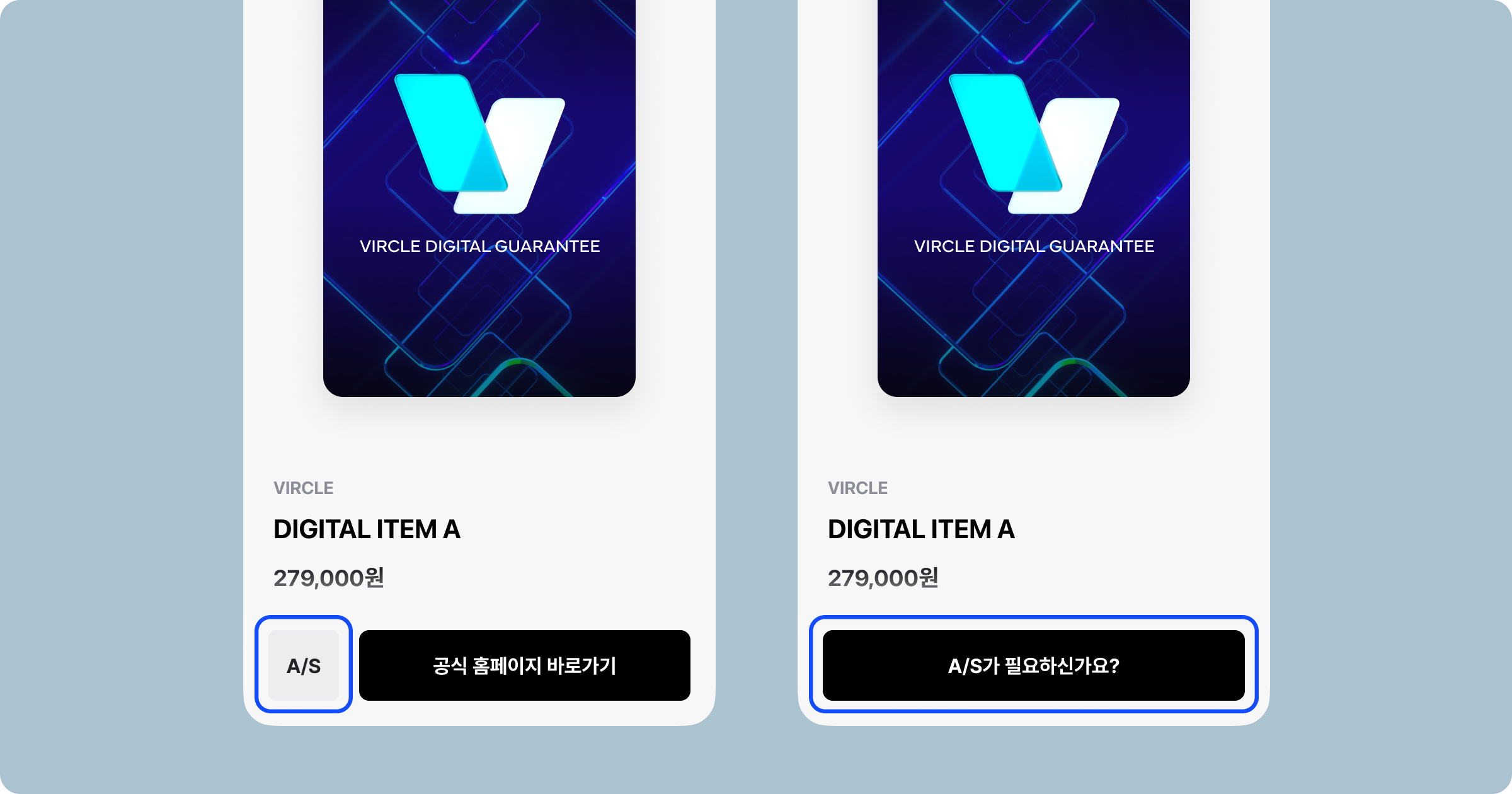 커스텀 버튼을 사용하지 않는다면, 'A/S가 필요하신가요?' 문구가 보여져요.