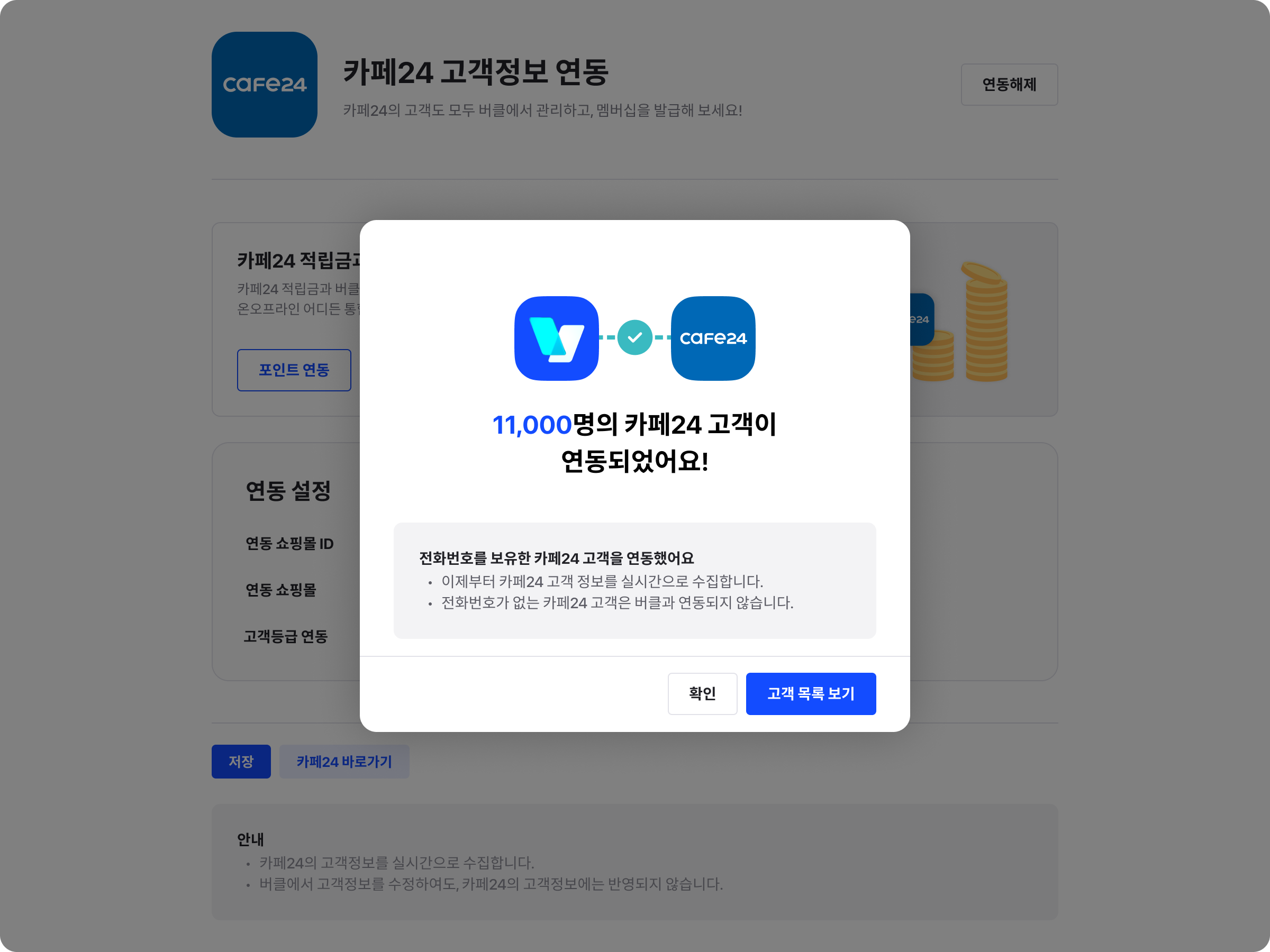 카페24 고객연동하면 연동된 고객 수를 확인할 수 있어요
