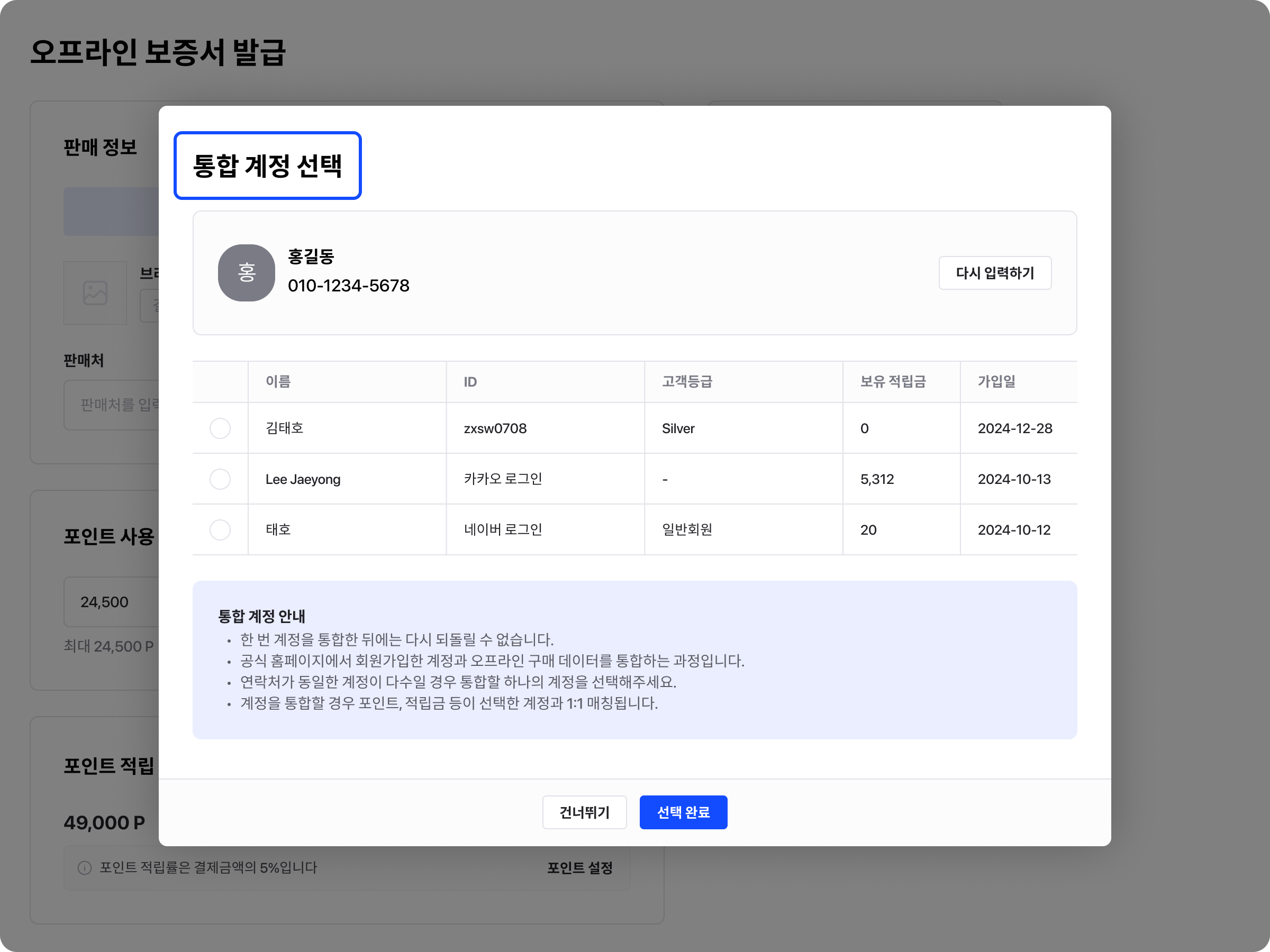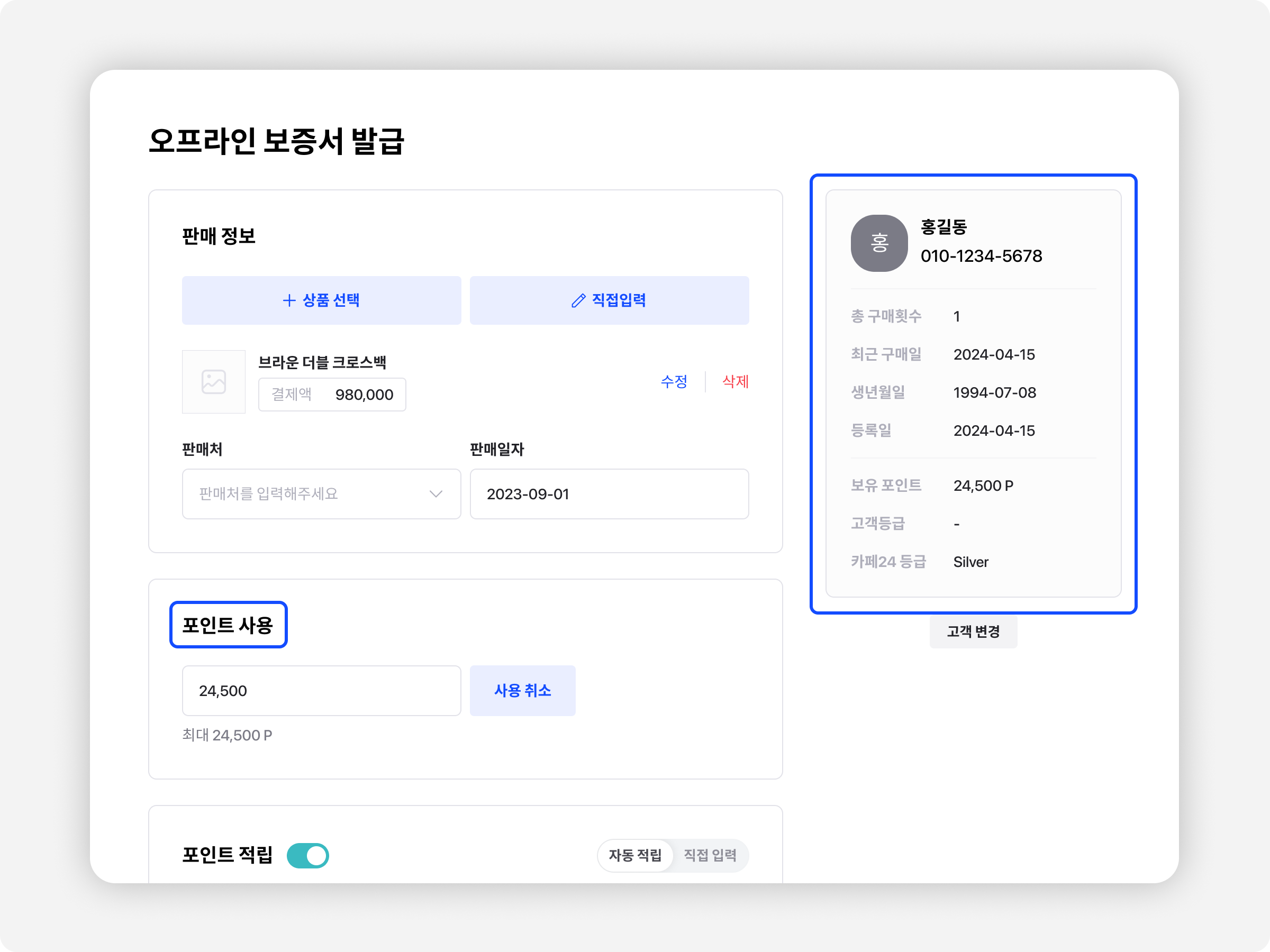 추가로 오프라인 보증서 발급 과정에서 고객이 보유한 포인트를 사용하는 기능이 추가됐어요