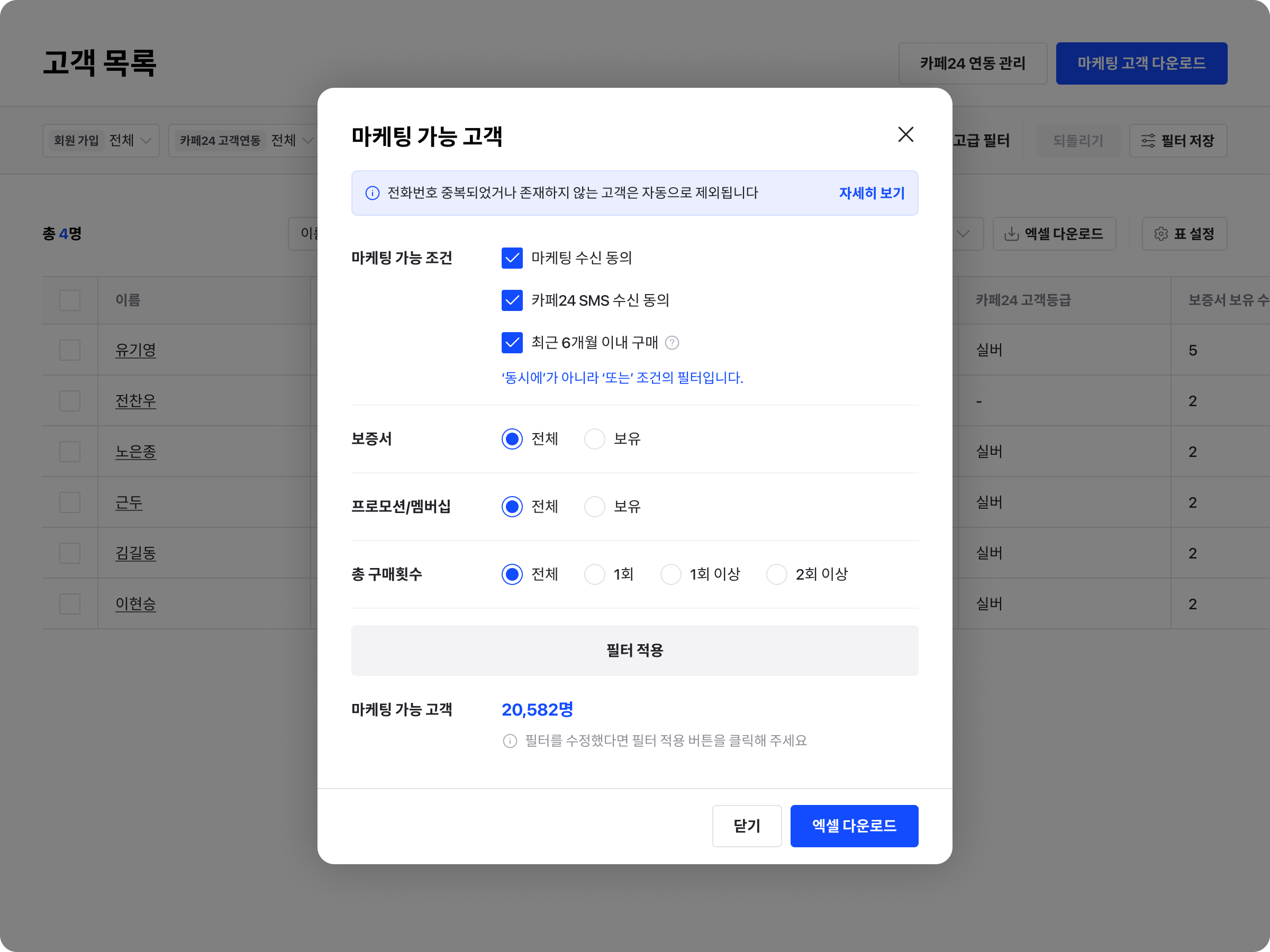 마케팅 동의 조건 외에도 프로모션, 보증서 보유 여부, 구매 여부 등으로 필터를 걸어보세요