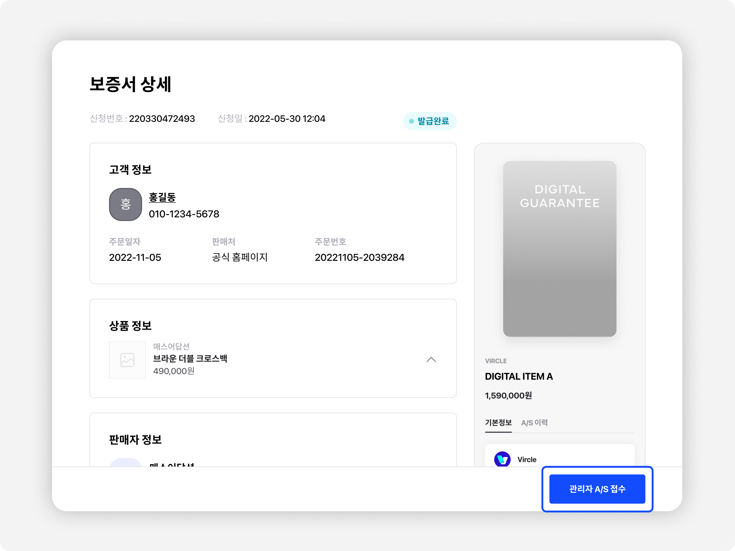 이 과정에서 자연스럽게 관리자 A/S 접수로 이어지도록, 보증서 상세 화면에서 [관리자 A/S 접수] 버튼을 클릭하면 A/S 접수하는 고객과 보증서가 선택된 상태로 A/S 접수할 수 있어요!