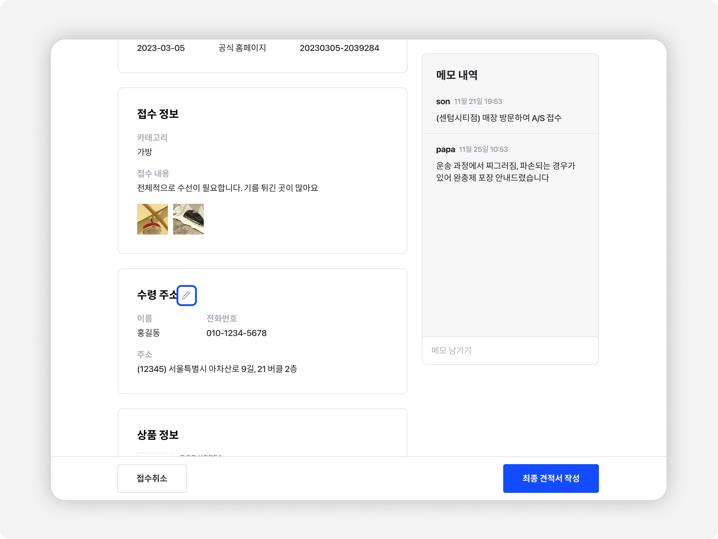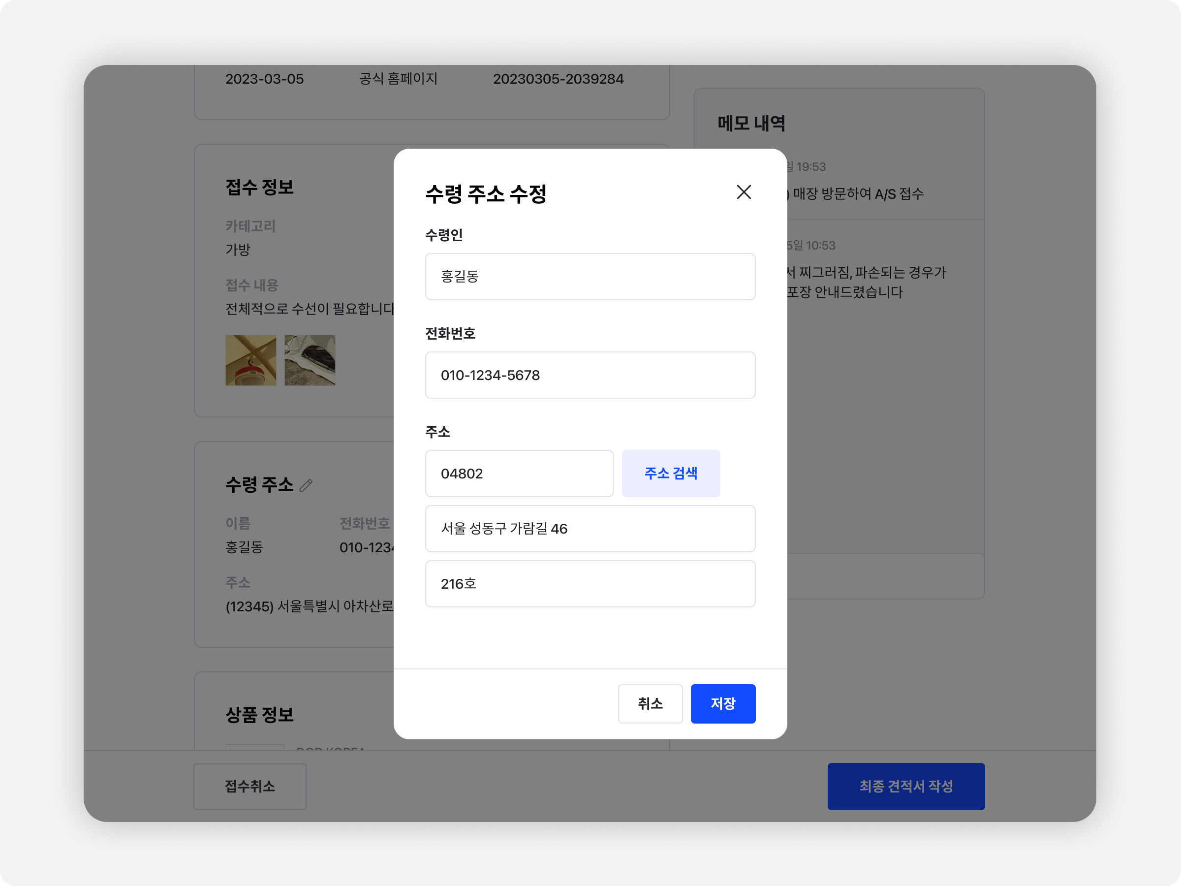 관리자 A/S 접수할 때 고객님께 주소까지 받기 어려운 상황이 있을 수 있는데요,