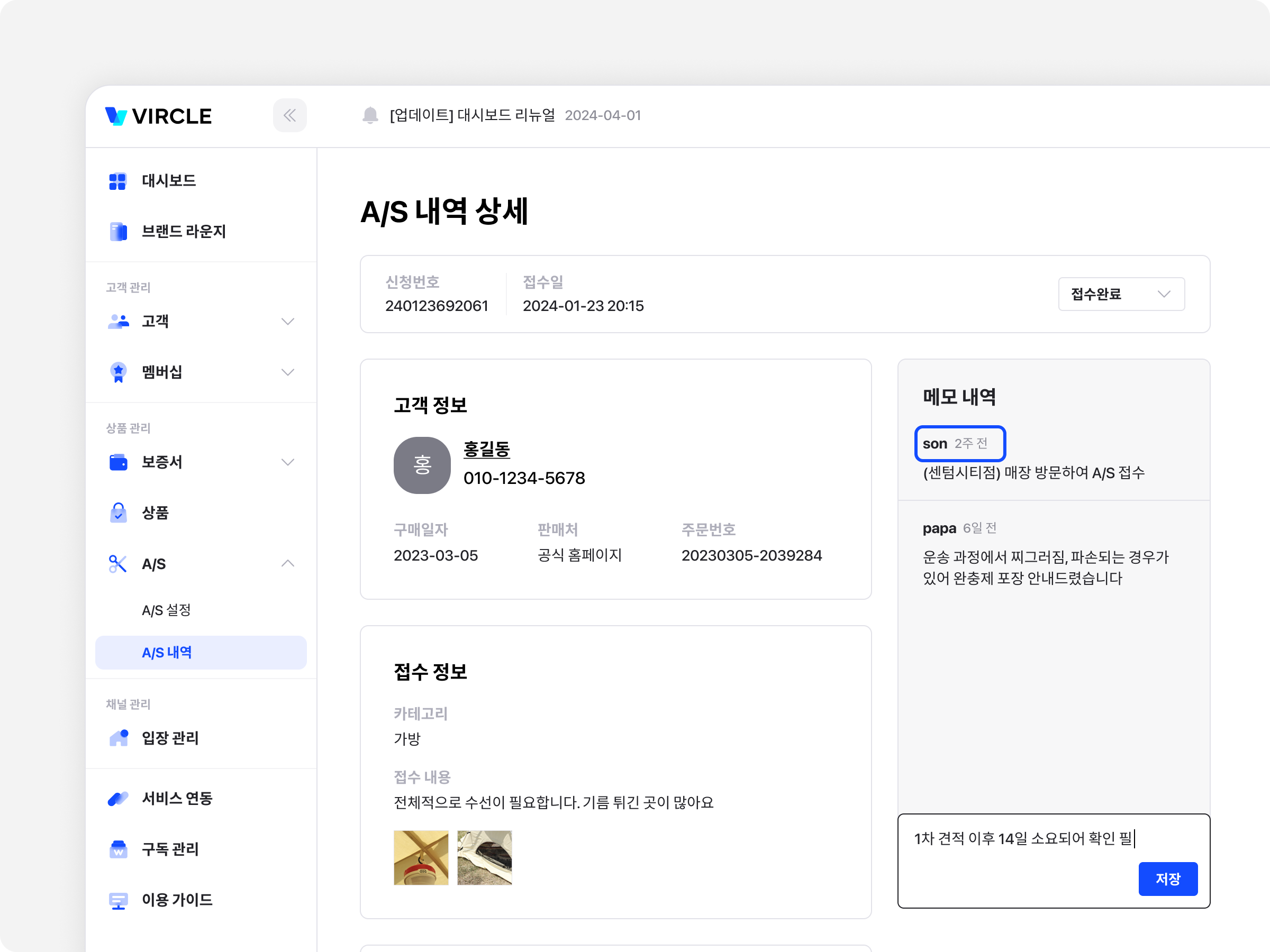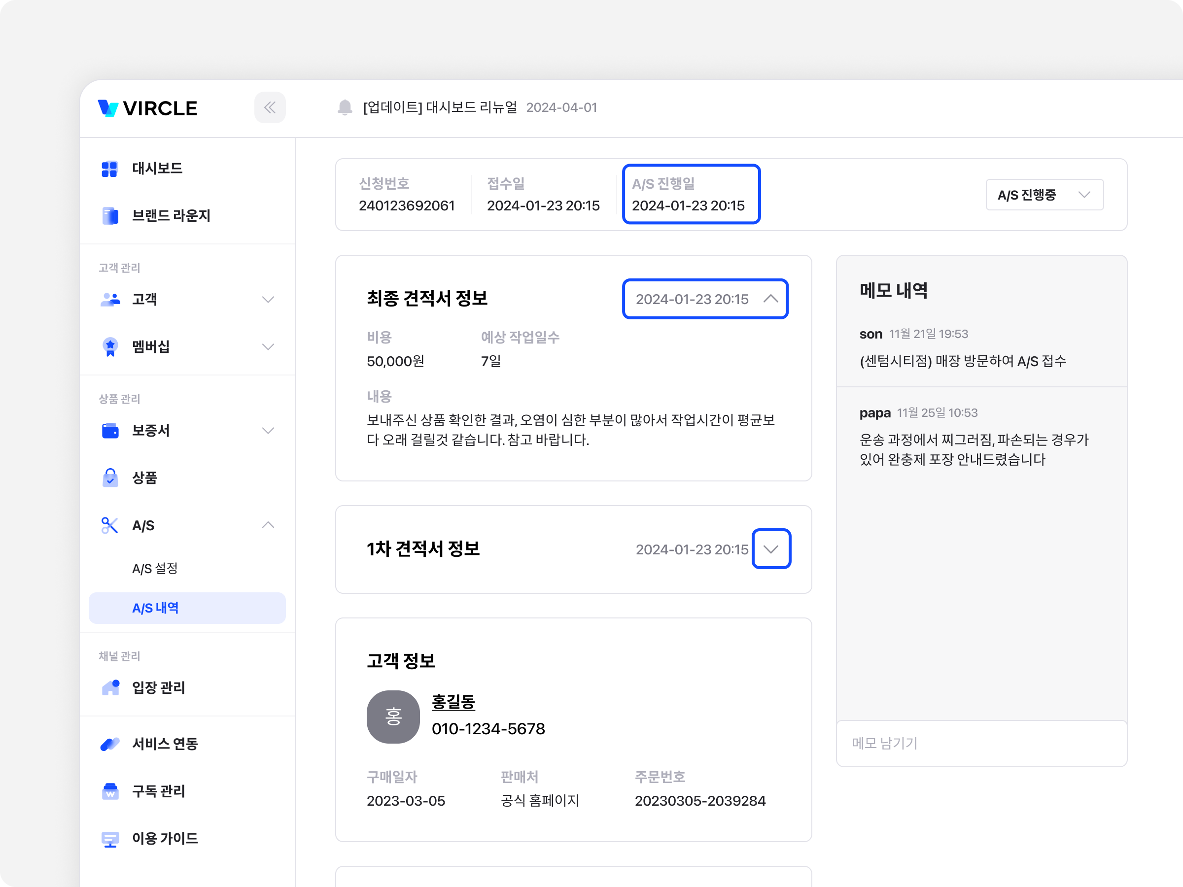 이번 업데이트에서는 관리자와 고객을 위해 A/S 사용성이 개선되었어요!