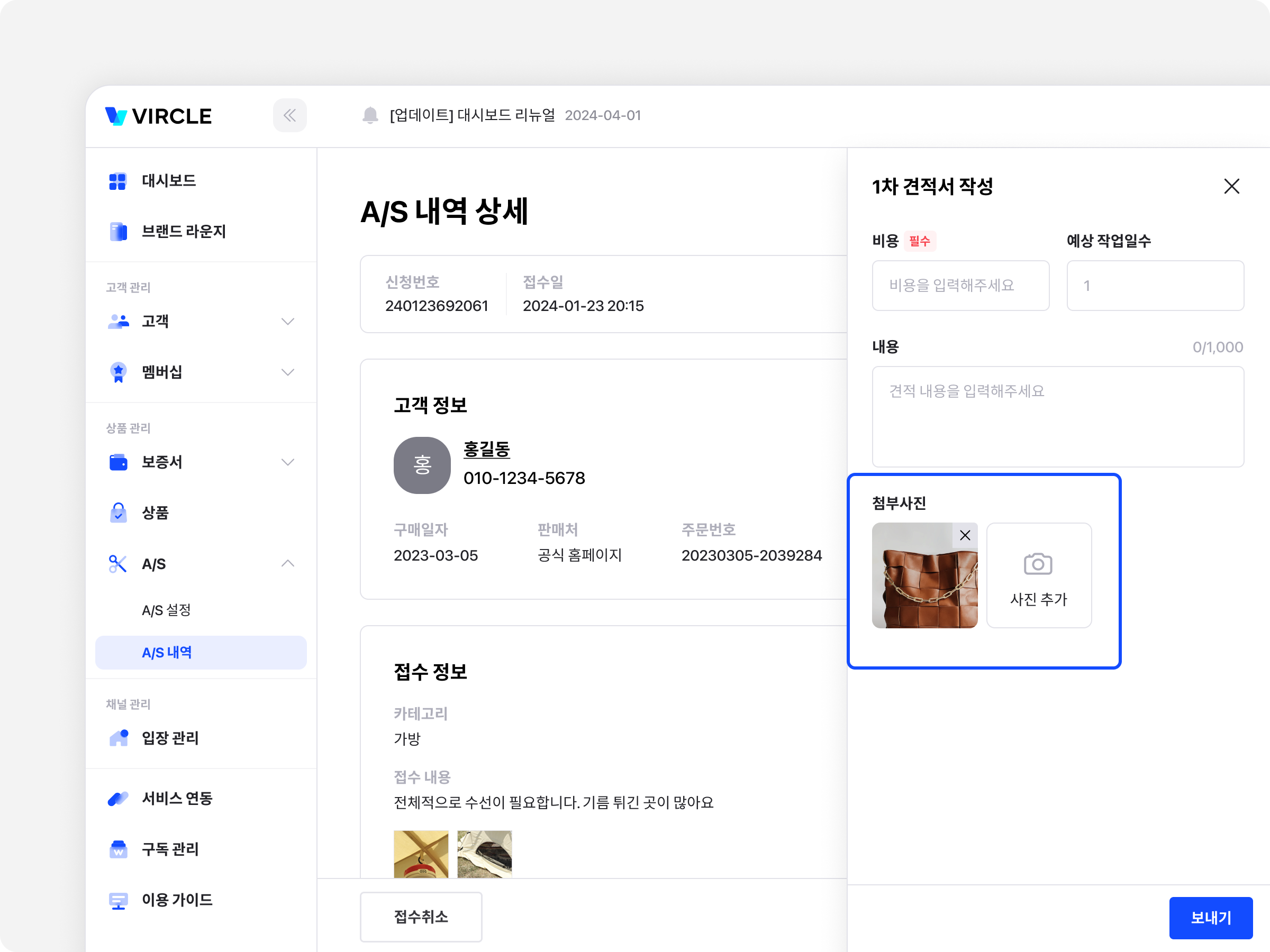 견적서를 보내거나 A/S 완료되었을 때 사진을 첨부할 수 있는 기능이 추가되었어요!