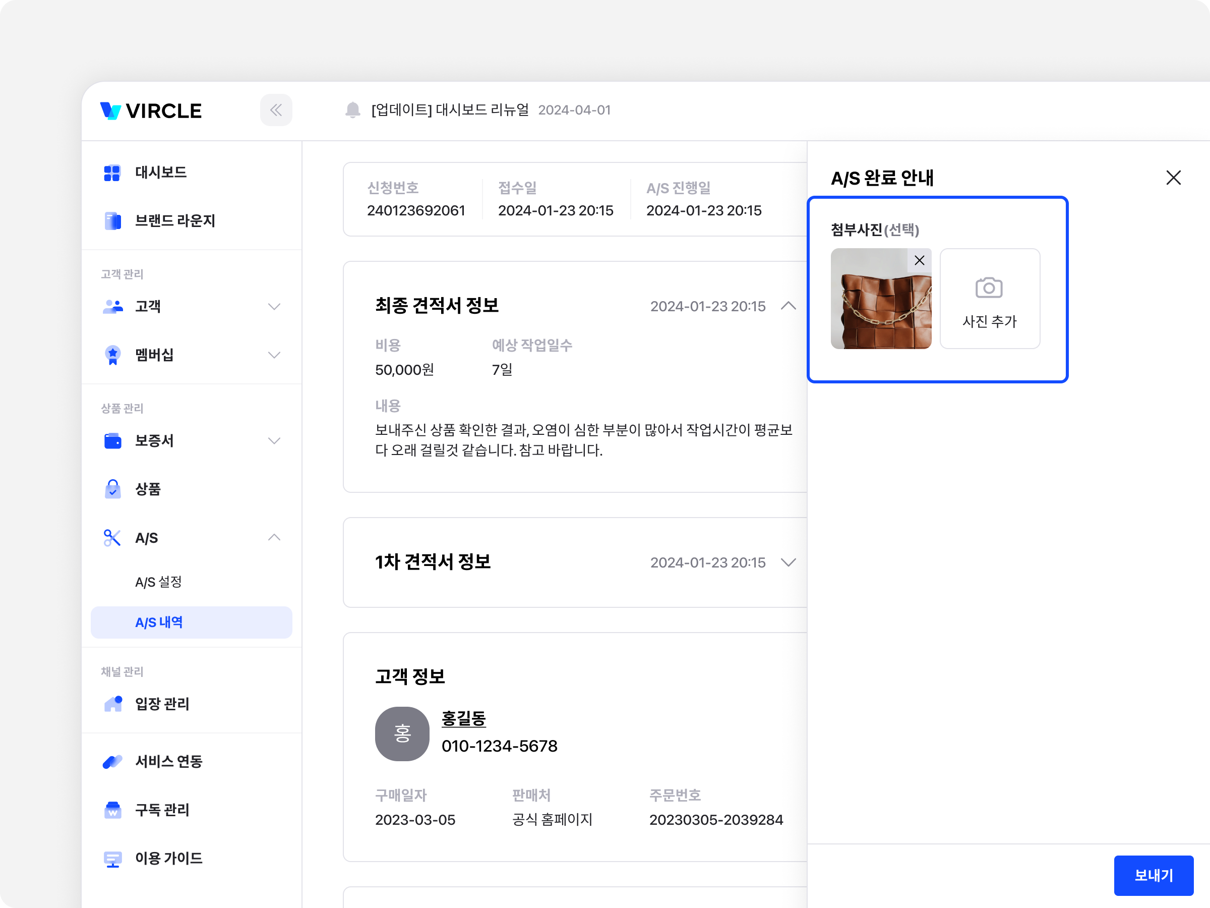 A/S 완료 안내 시 사진 첨부