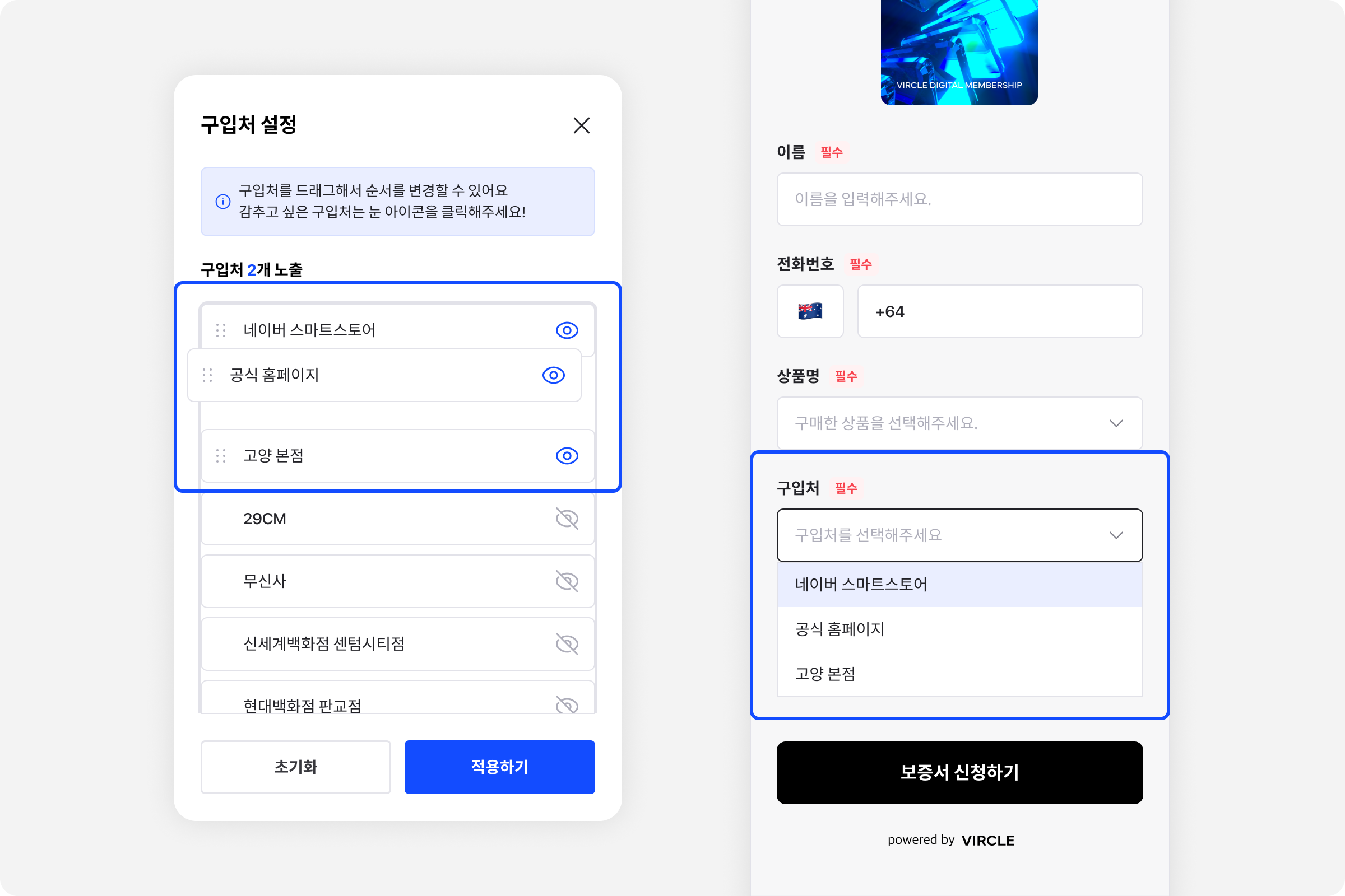 구입처의 순서와 노출여부를 설정할 수 있도록 개선되었습니다!