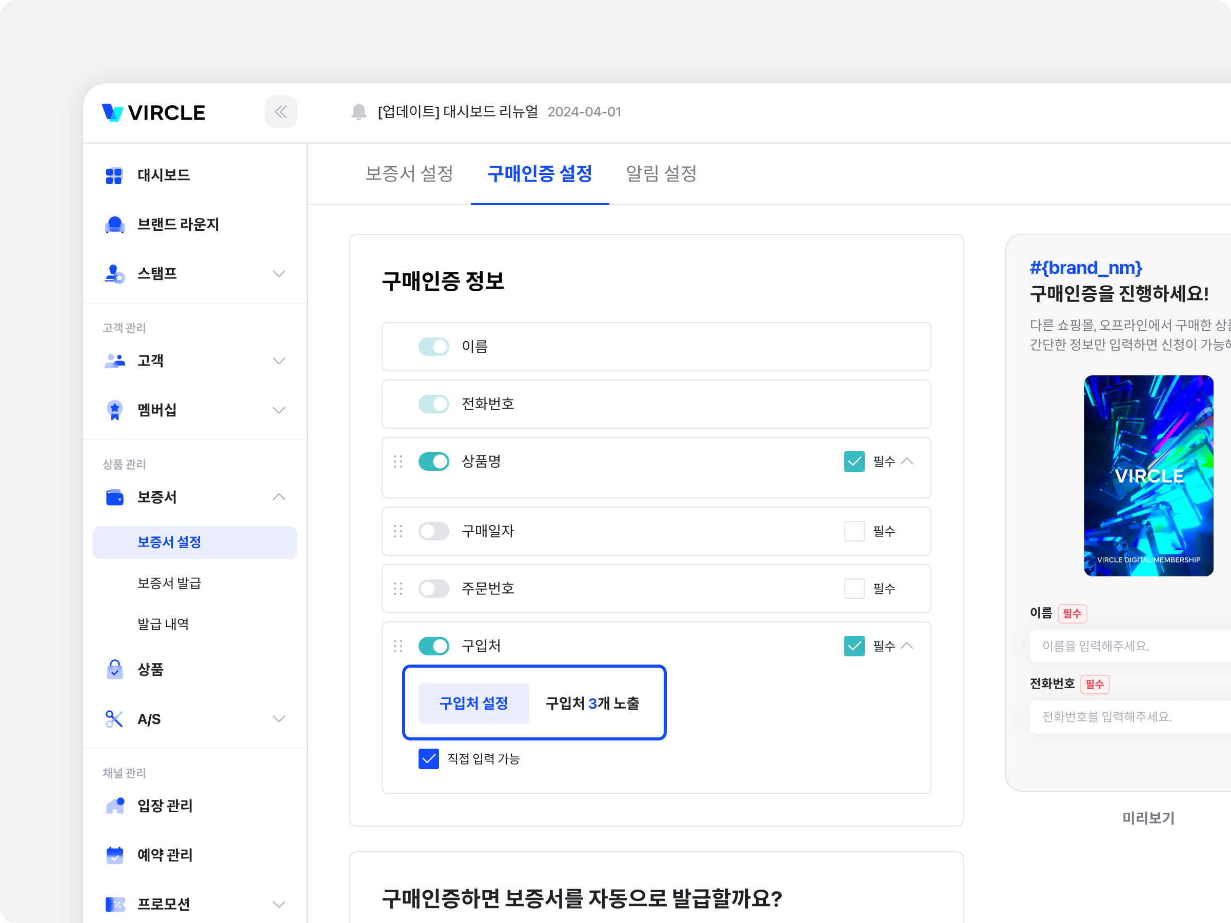 보증서 설정 → 구매인증 설정 → 구입처 설정