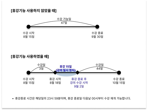 (ex. 남은 수강일수가 10일일 때 휴강을 신청하시면, 휴강 종료 후 10일 동안 강의를 들을 수 있습니다.)