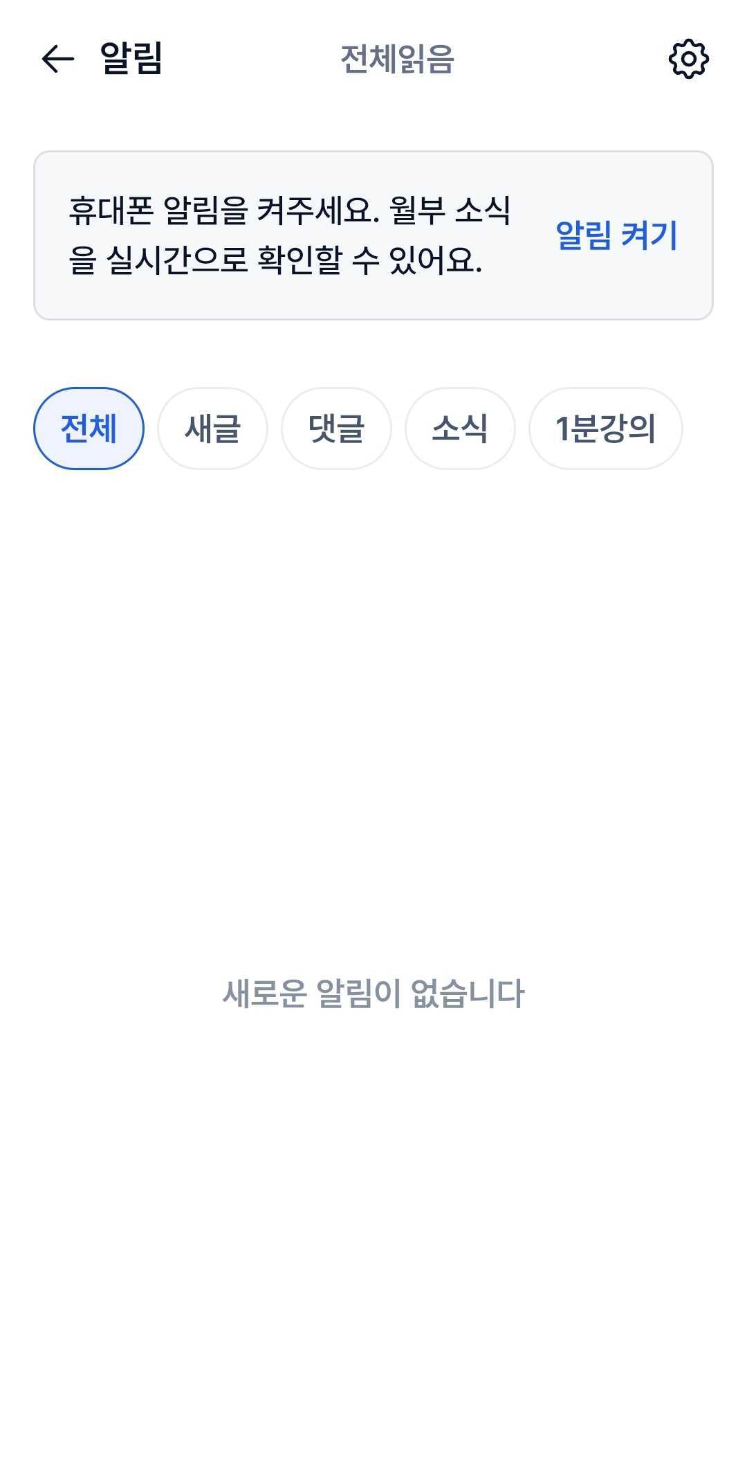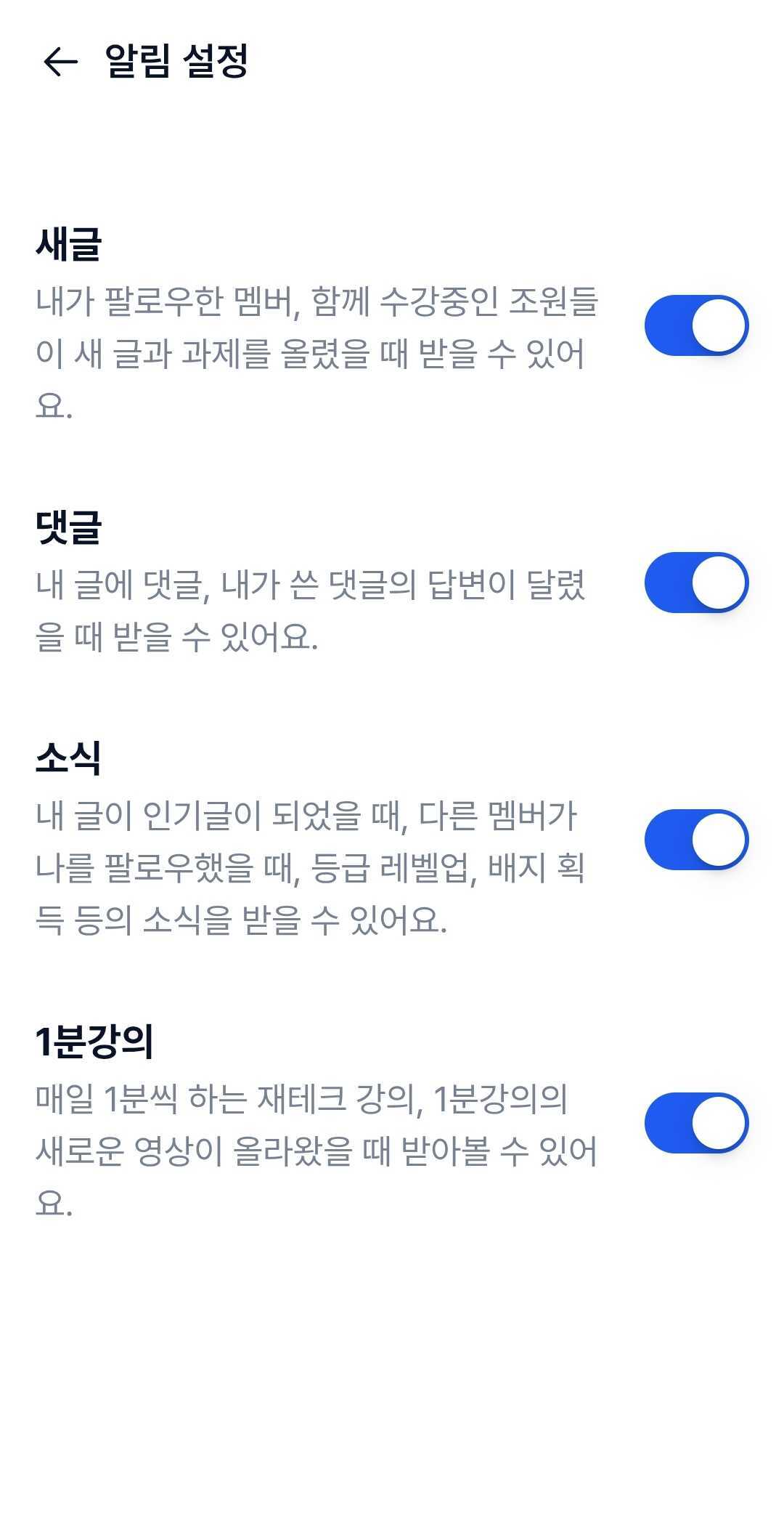 새 글, 댓글, 소식, 1분 강의 알림에 대하여 개별적으로 알림을 켜고 끌 수 있습니다.
