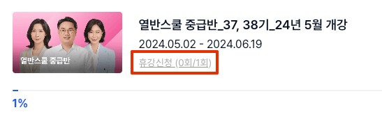 강의 수강 기간 하단에서 휴가신청 버튼을 확인하실 수 있으며, 해당 버튼을 눌러 직접 휴강 신청을 할 수 있습니다.