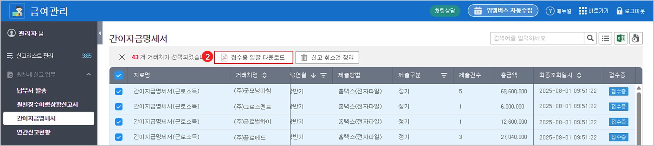 다운로드할 거래처를 선택하면 상단에 기능 버튼이 생성되고 {접수증일괄 다운로드}를 클릭하면 선택한 거래처의 신고서가 ZIP 파일로 다운로드됩니다.