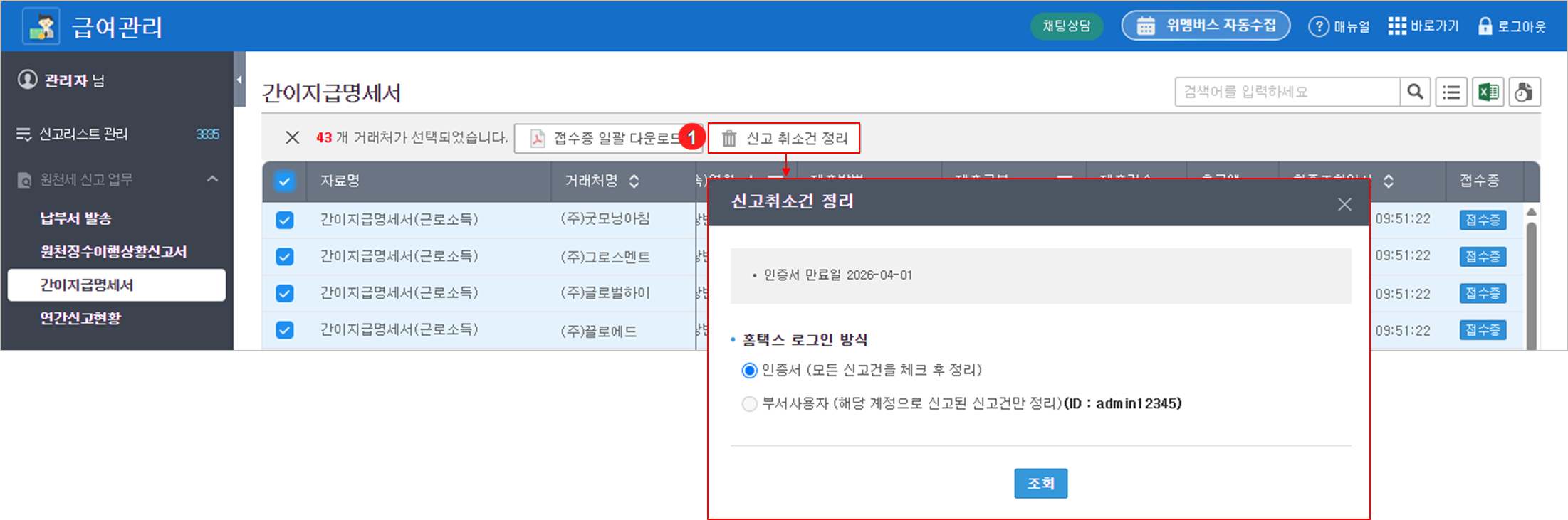 홈택스에서 신고를 취소한 경우, 화면에 표시된 취소 건을 삭제하여 정리할 수 있습니다.