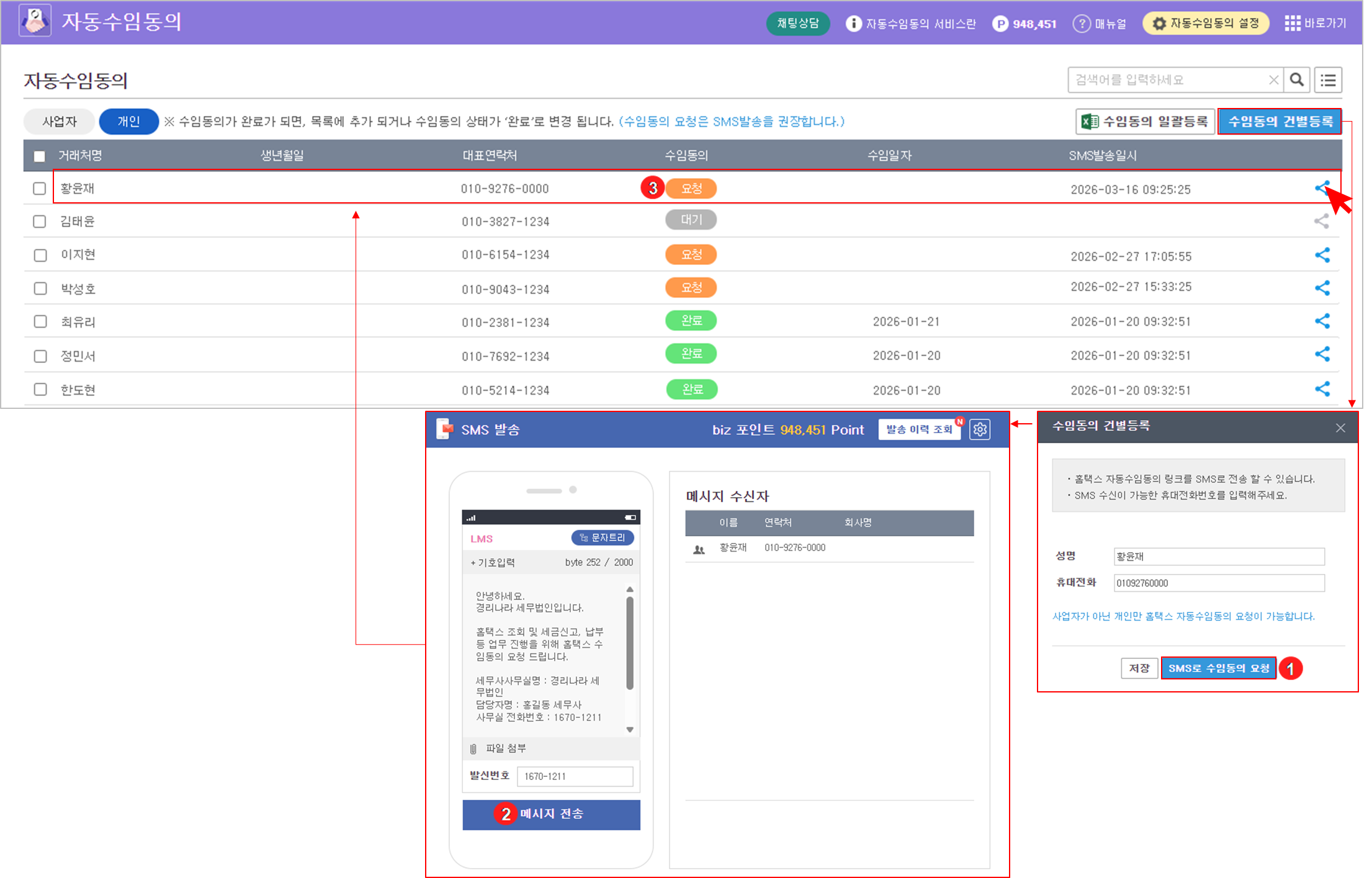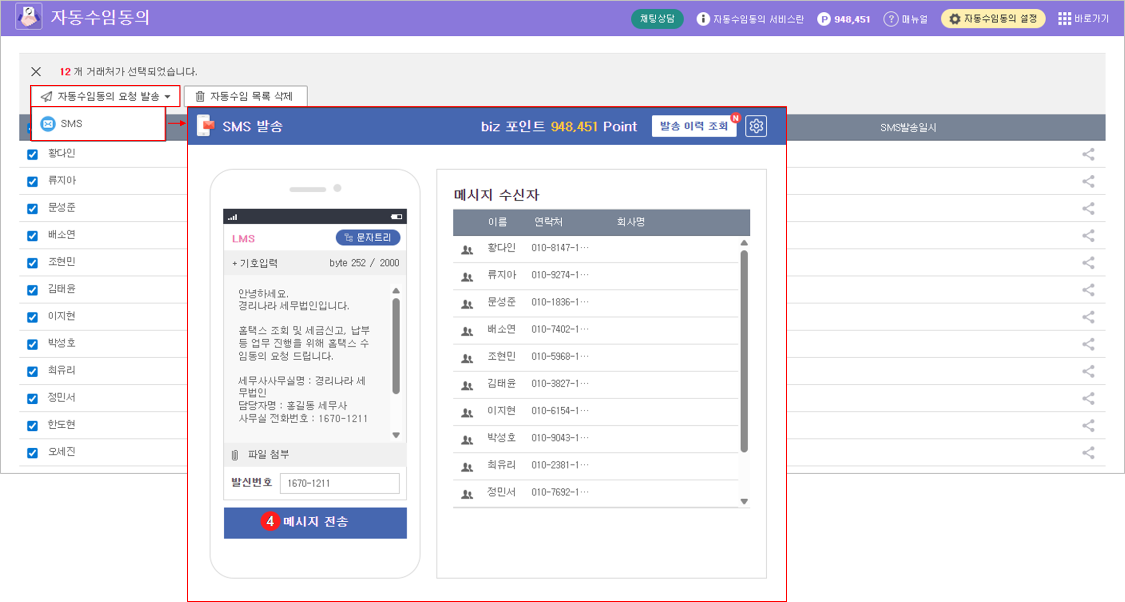 ④ 일괄 등록된 목록에서 요청할 거래처를 선택한 후, [자동수임동의 요청 발송] 버튼을 클릭하면 모