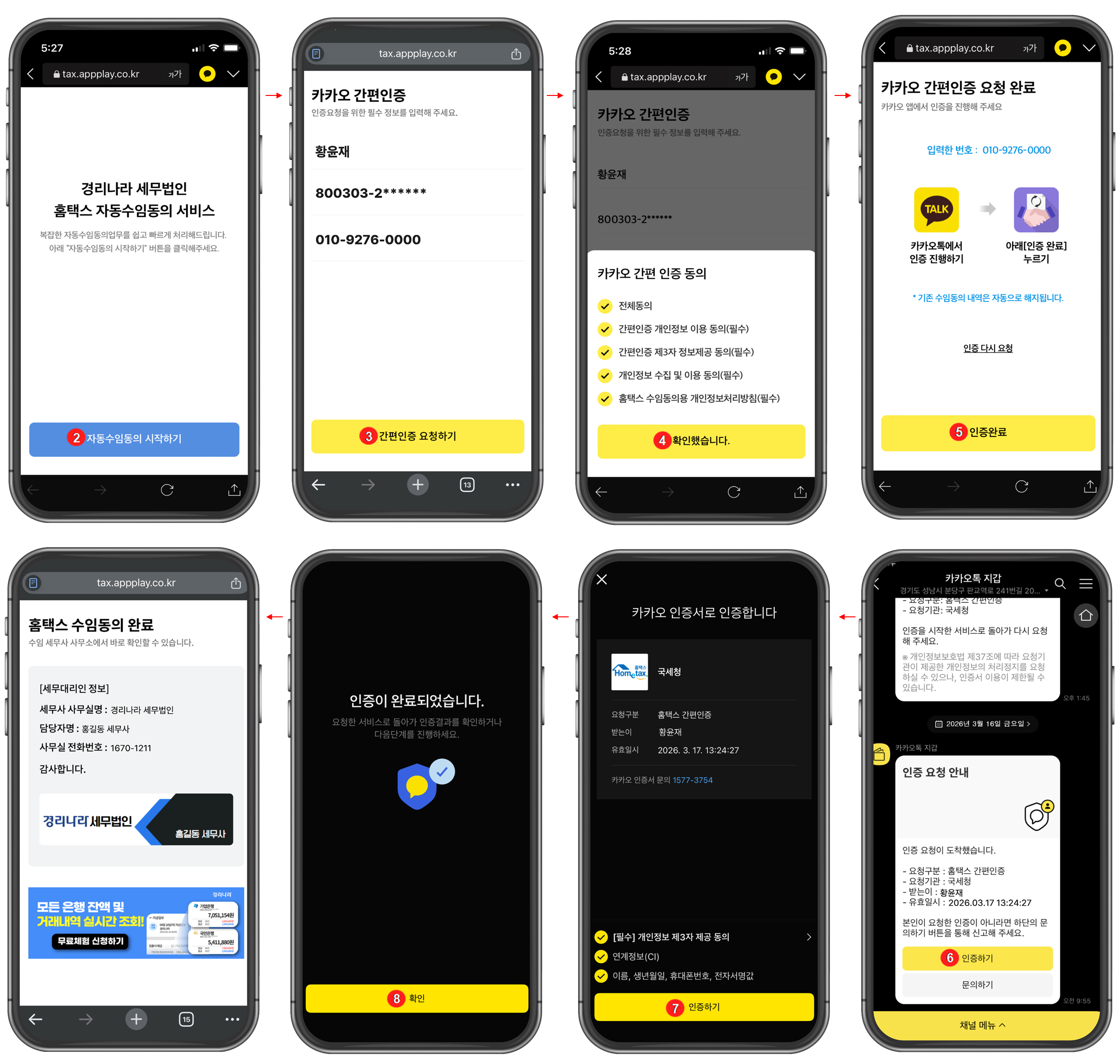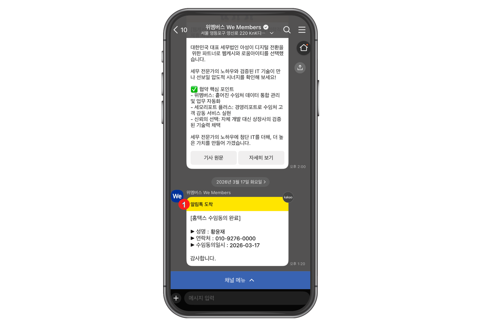 수신자(사업자)는 별도의 로그인이나 앱 설치 없이, 문자 속 링크를 클릭하여 카카오톡 인증만으로 수임동의를 즉시 완료할 수 있습니다.